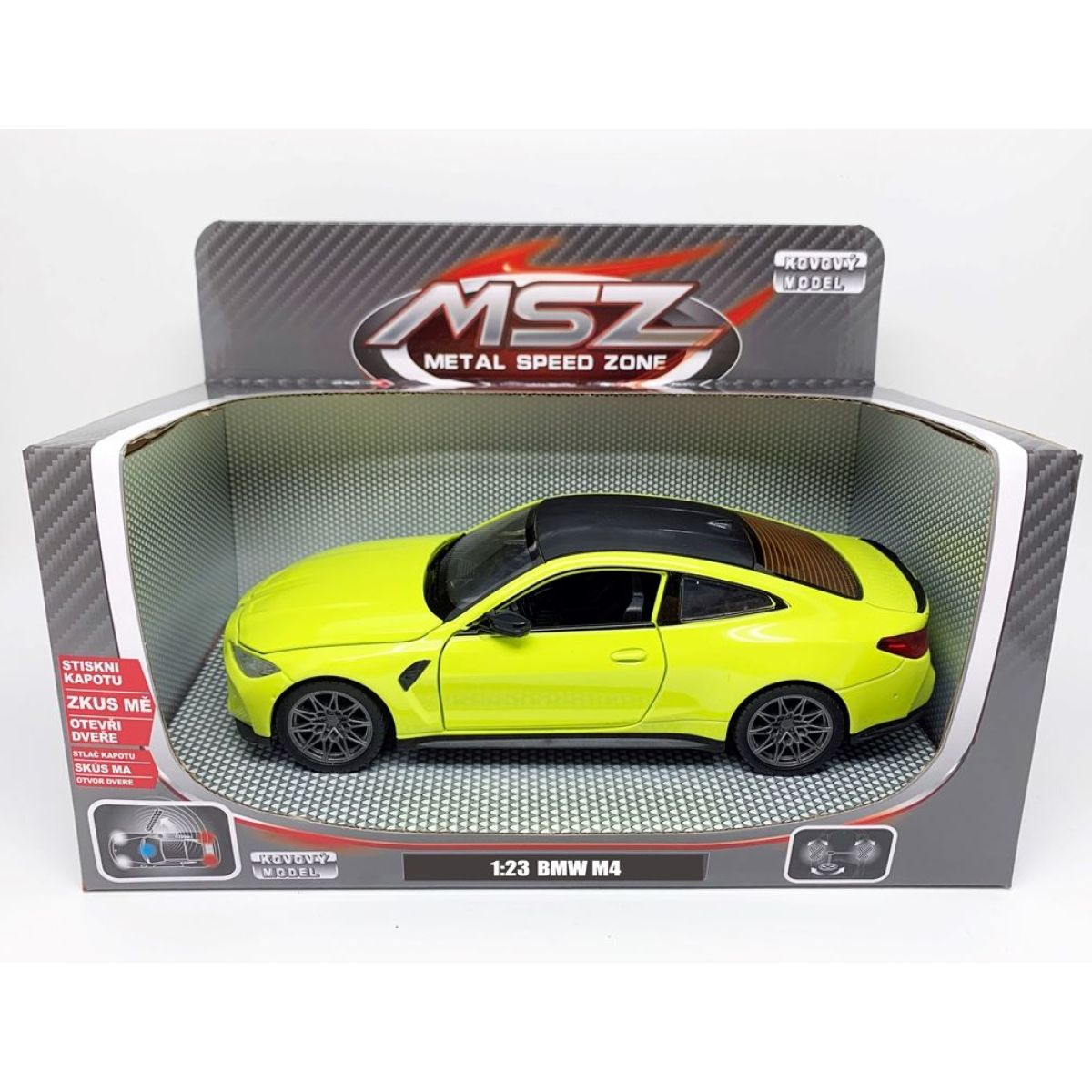 Detailně zpracovaný kovový model vozu BMW M4 G82 v měřítku 1:23 je určen pro děti od 3 let i sběratele.