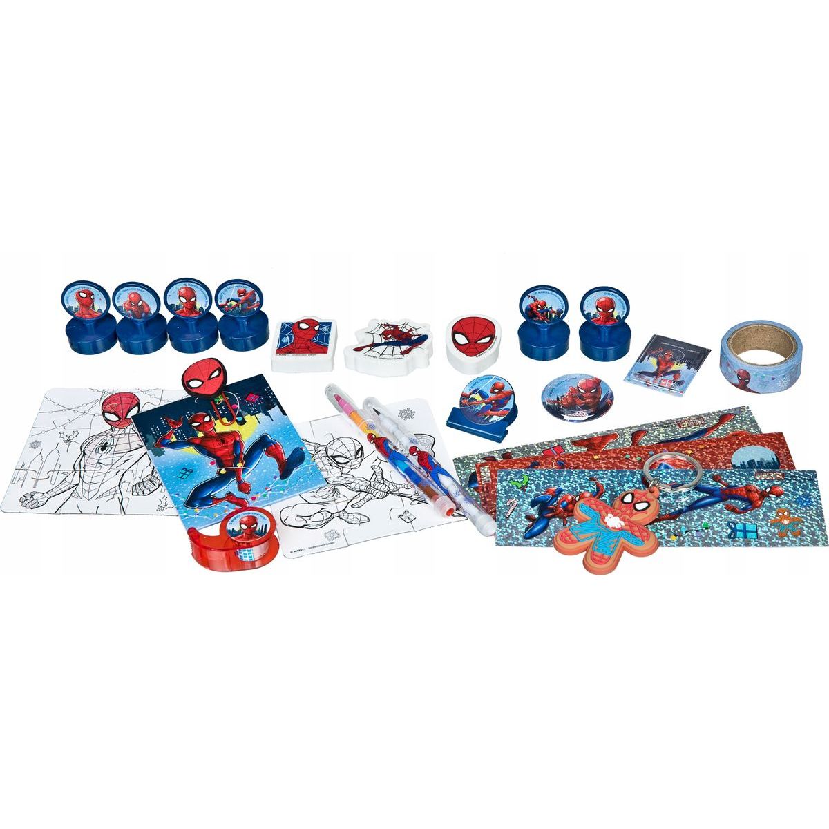 Balení obsahuje: 6 x mini razítka, 2 x puzzle, 1 kroužek na klíče, pásku + dávkovač, 3 x laserové nálepky, mini tužku, mini pastelku, 2 x třepací nálepky, 2 x kancelářské sponky, poznámkový blok, 3 x tvarované gumy, Washi pásku.