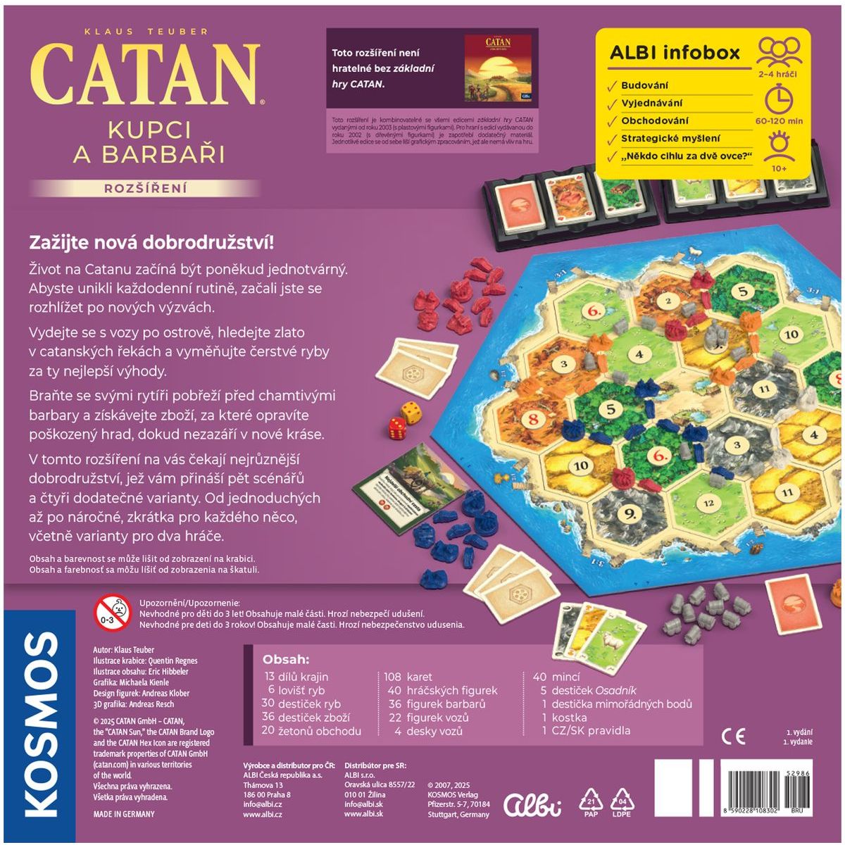 Catan – Kupci a barbaři je rozsáhlé rozšíření k populární strategické hře Catan – Osadníci z Katanu. Přidává pět nových scénářů, které rozšiřují hratelnost o nové mechaniky, suroviny a výzvy. Hráči se mohou vydat na cestu s vozy napříč ostrovem, lovit ryby, obchodovat se zbožím nebo bránit pobřeží před nájezdy barbarů.