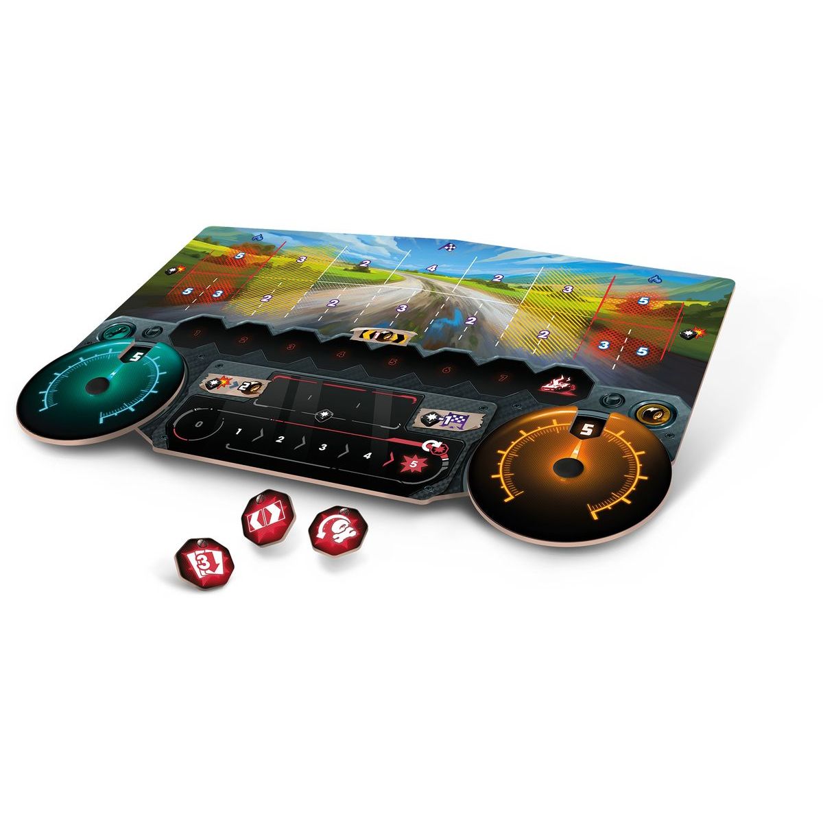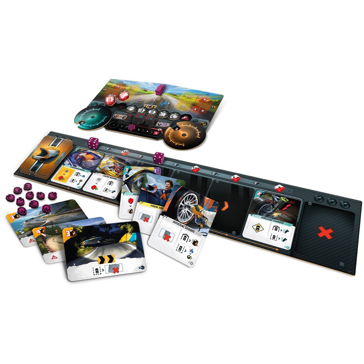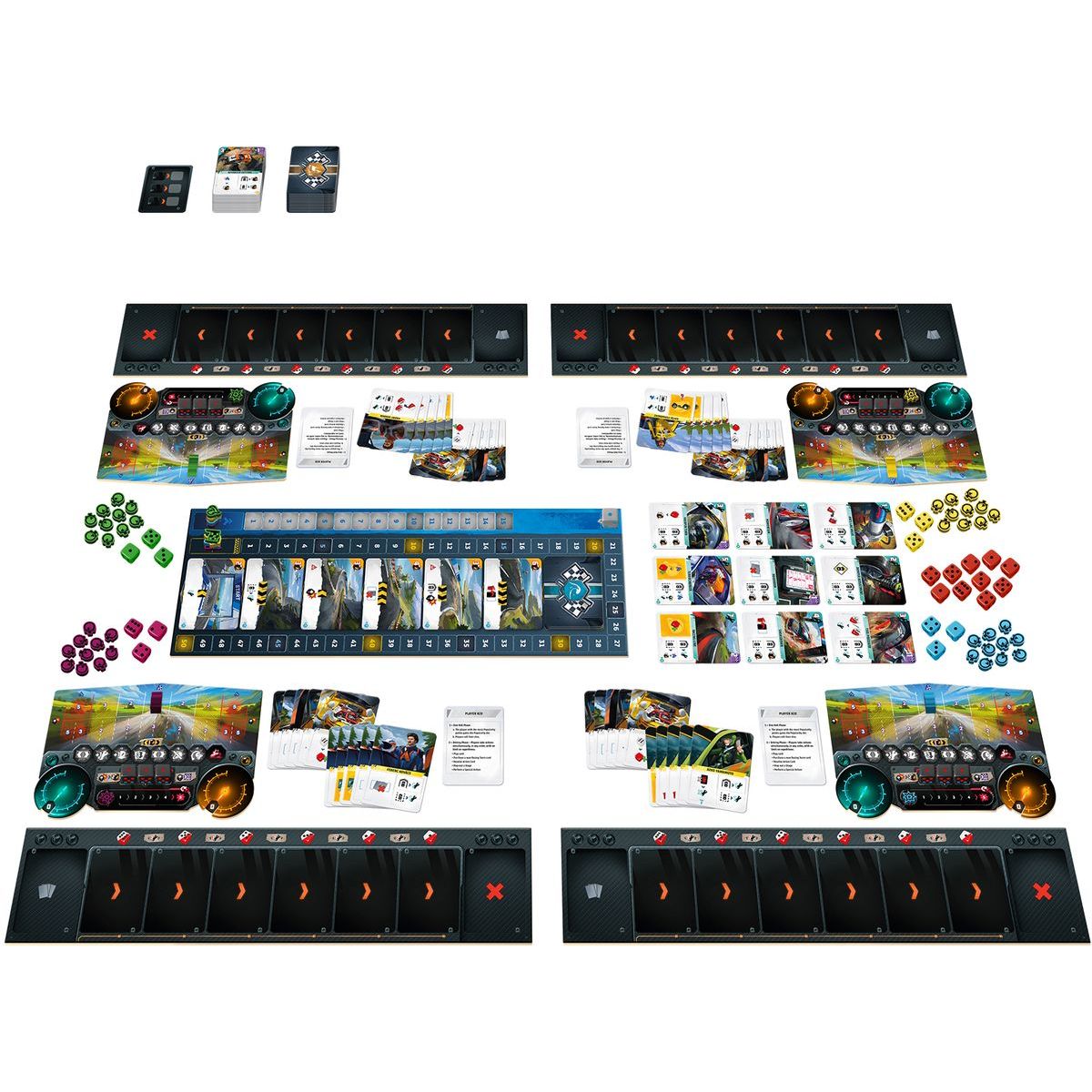 Obsah balení: herní deska, 4 hráčské desky, 4 desky vozidla, 238 karet, 14 žetonů hráče, 3 kostky hráče, 12 kostek poškození, 10 červených kostek, 1 kostka popularity, pravidla