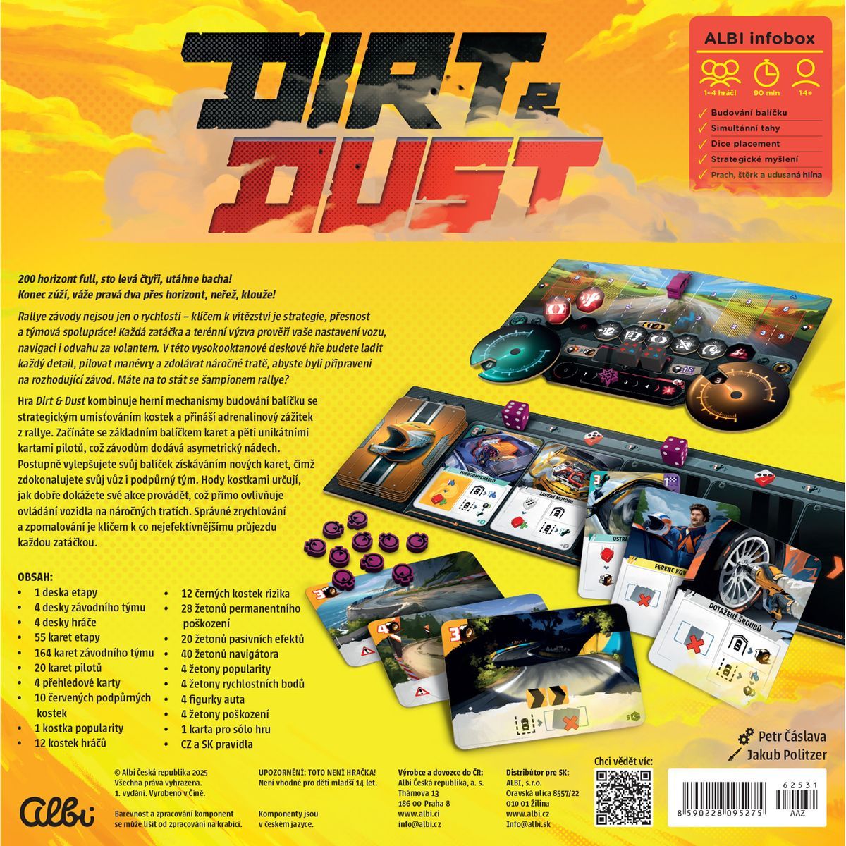 Dirt & Dust je strategická desková hra zaměřená na rallye závody, která kombinuje mechanismy budování balíčku s taktickým umisťováním kostek. Hráči zdolávají náročné tratě, ladí nastavení vozidla a využívají asymetrické schopnosti pilotů, aby maximalizovali své šance na vítězství. Hra rozvíjí strategické myšlení, plánování akcí a schopnost reagovat na proměnlivé situace na trati. Doporučená doba hraní je přibližně 90 minut.