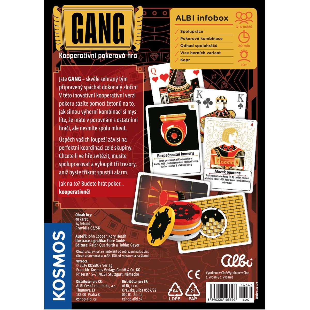 Albi Gang je kooperativní stolní hra založená na inovativní verzi pokeru, kde hráči tvoří sehraný gang a společně plánují loupeže. Hráči sází žetony podle síly svých kombinací a musí koordinovat své kroky, aniž by spolu mluvili. Cílem je získat 3 trezory, aniž by byl spuštěn alarm třikrát. Hra rozvíjí strategické myšlení, týmovou spolupráci a schopnost odhadnout akce ostatních hráčů. Doporučená doba hraní je přibližně 20 minut.