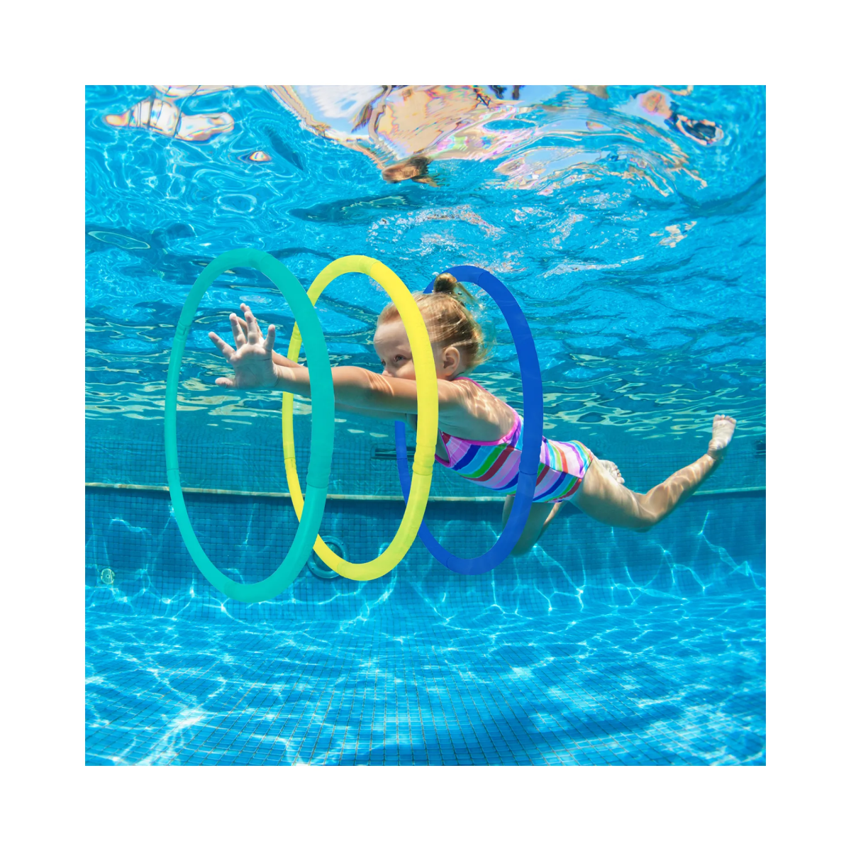 Hra Podvodní kruhy přináší zábavnou aktivitu do bazénu, která podporuje pohyb ve vodě a procvičování plaveckých dovedností. Díky speciálním závažím zůstávají kruhy pod vodní hladinou a vytvářejí podvodní dráhu, kterou mohou hráči proplouvat.