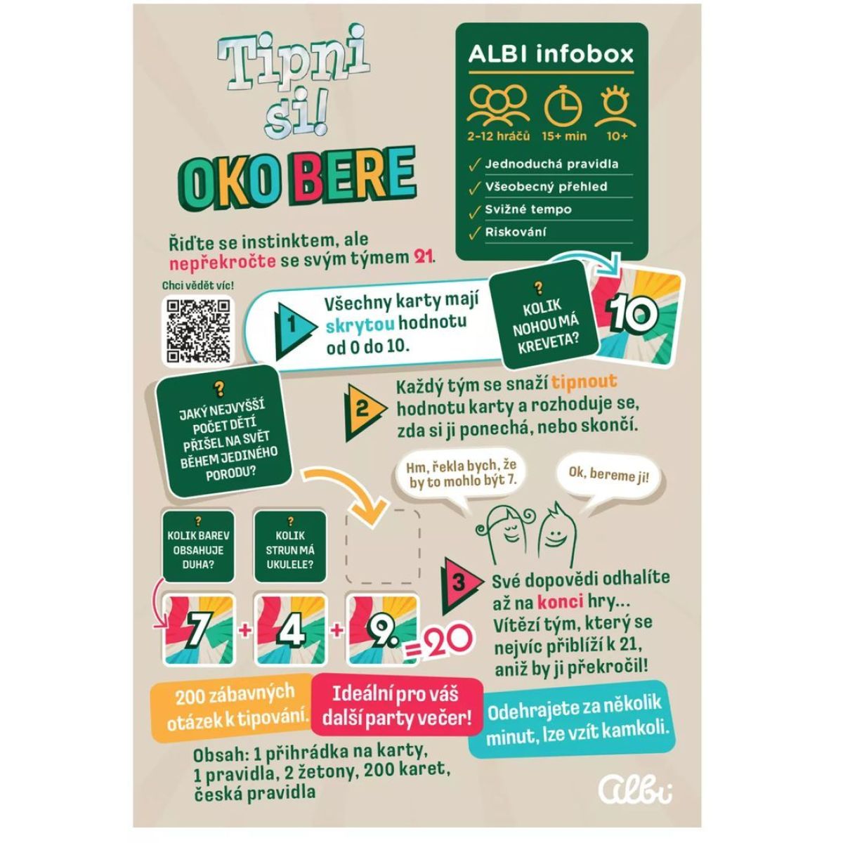 Albi Tipni si! Oko bere je svižná týmová společenská hra zaměřená na odhad, logiku a schopnost správně vyhodnotit riziko. Každá karta skrývá hodnotu od 0 do 10 a zároveň odpověď na jednu z více než 200 originálních otázek. Úkolem hráčů je co nejpřesněji odhadnout správnou hodnotu a rozhodnout se, zda pokračovat ve hře, nebo včas skončit.