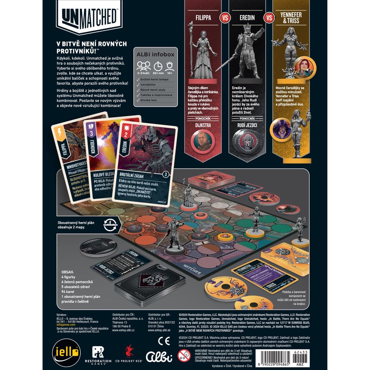 Albi Unmatched Zaklínač – Pád říší je strategická karetní bojová hra, kde se hráči utkávají v rychlých a napínavých soubojích. Vyberte si hrdinu, zvolte bojiště a využijte jedinečné schopnosti a balíček k poražení soupeře. Hra umožňuje kombinovat hrdiny a bojiště z různých sad systému Unmatched, čímž vznikají nové herní výzvy a neomezené možnosti strategií. Rozvíjí taktické myšlení, plánování a strategické schopnosti.