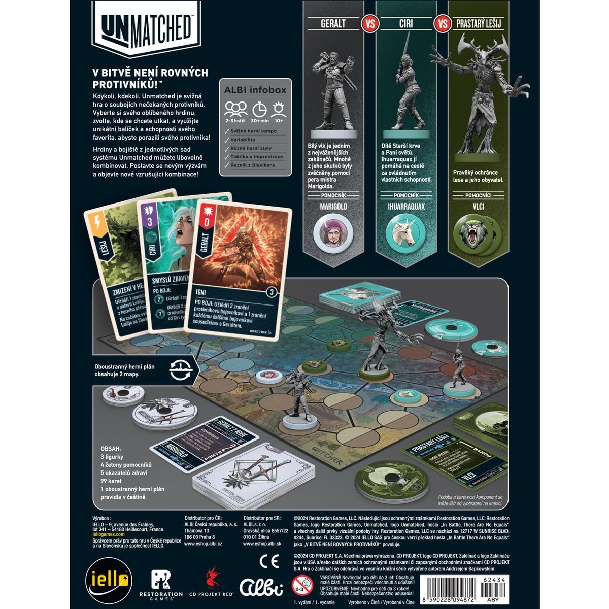 Unmatched Zaklínač - Stříbro a ocel je strategická karetní hra založená na soubojích hrdinů ságy Zaklínač. Hráči si vybírají své oblíbené postavy, jako jsou Geralt, Ciri nebo Prastarý Lešij, a využívají jejich unikátní schopnosti a balíčky k poražení protivníka. Hra kombinuje taktiku, strategii a přizpůsobitelnost, protože hrdiny a bojiště lze libovolně kombinovat s dalšími sadami Unmatched.