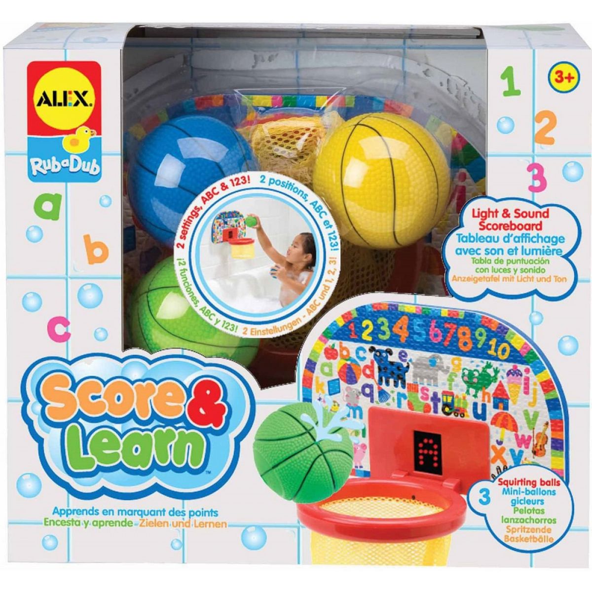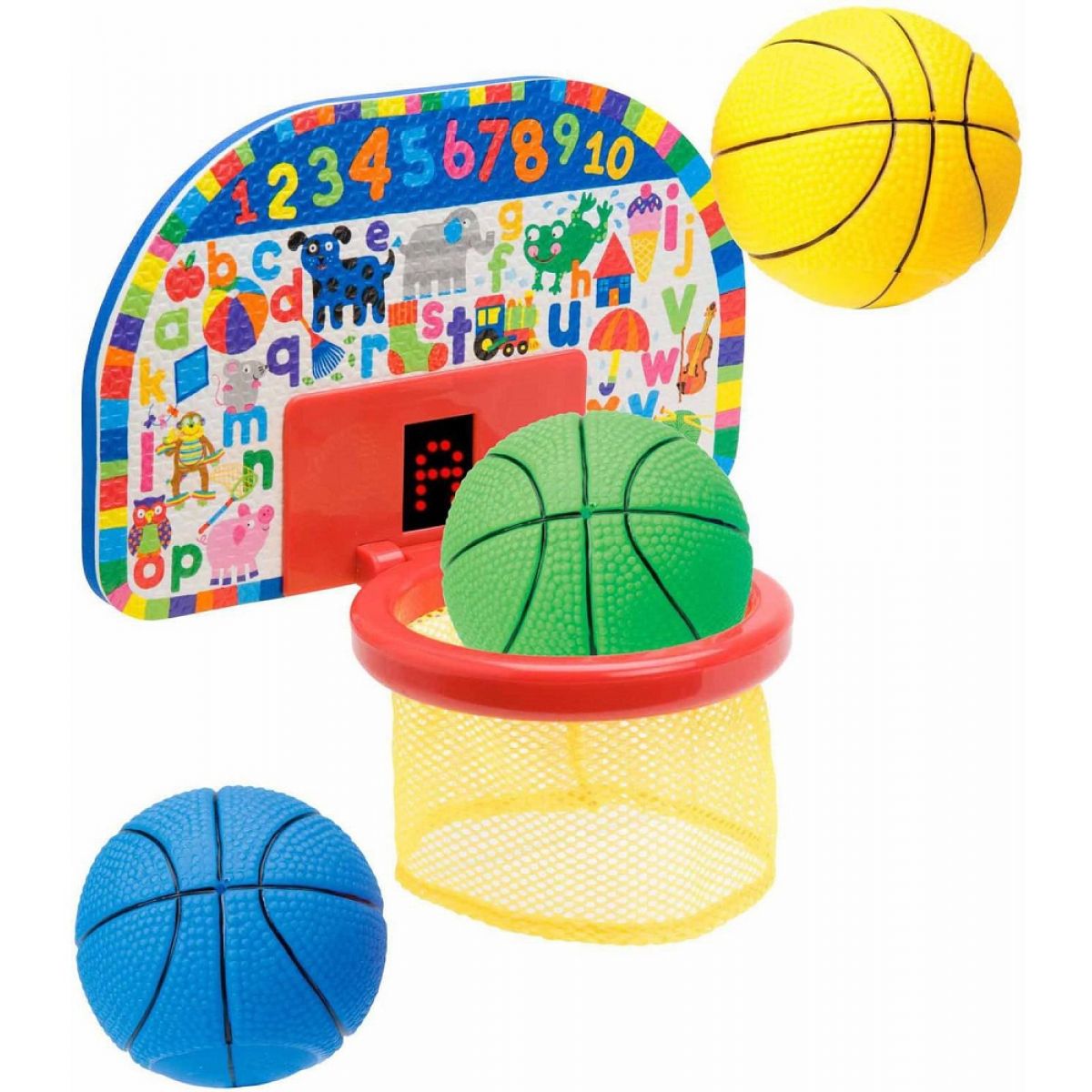 - V balení naleznete basketbalovou tabuli s košem a 3 pěnové míčky. Na tabuli se zobrazují trefené koše.
