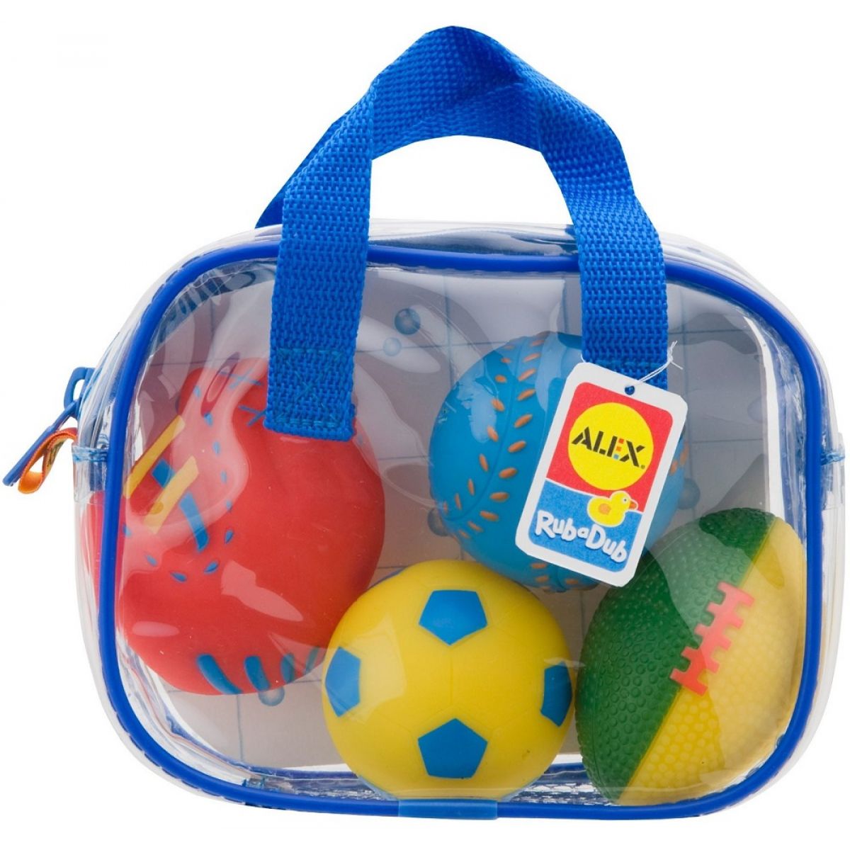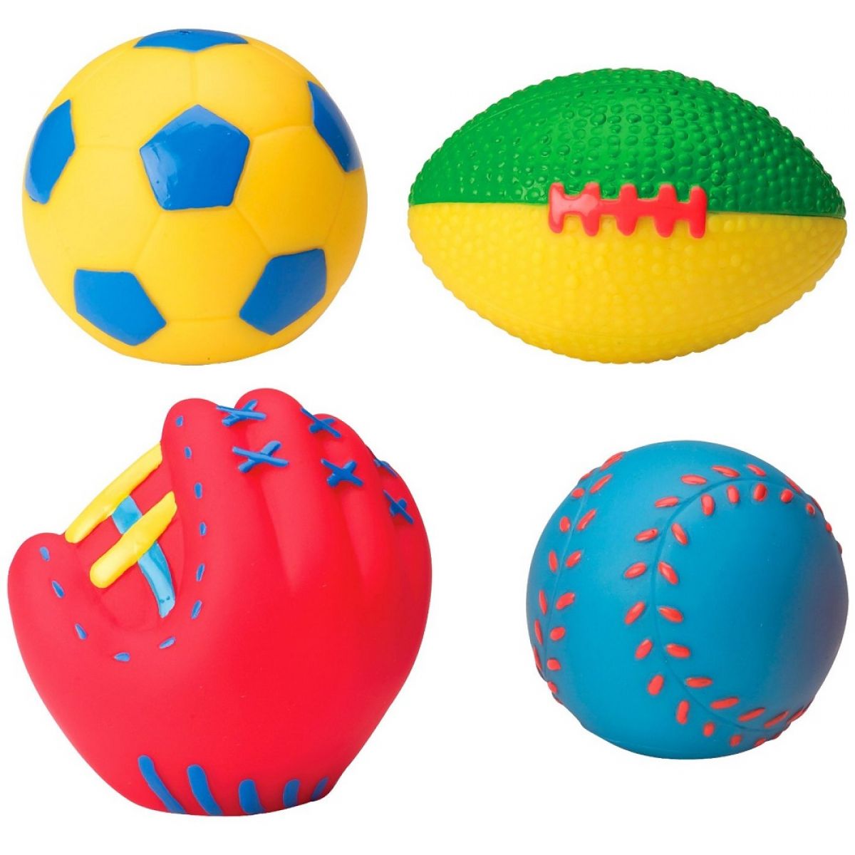 Měkké, barevné, stříkací figurky sportovních míčků do vany.