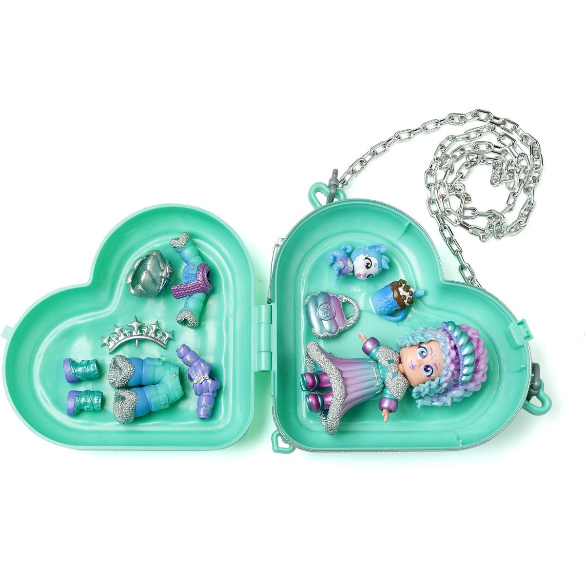 Obsah balení: panenka Chloe, 3 outfity, 2 páry bot, 2 tiáry, svačinka, mazlíček, kabelka ve tvaru srdce