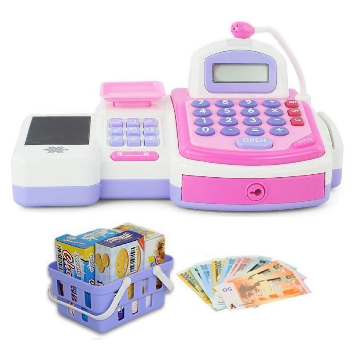 Obsah balení: pokladna s kalkulačkou a mikrofonem, nákupní košík, různé potraviny, kreditní karty, papírové bankovky, plastové mince a klíč.