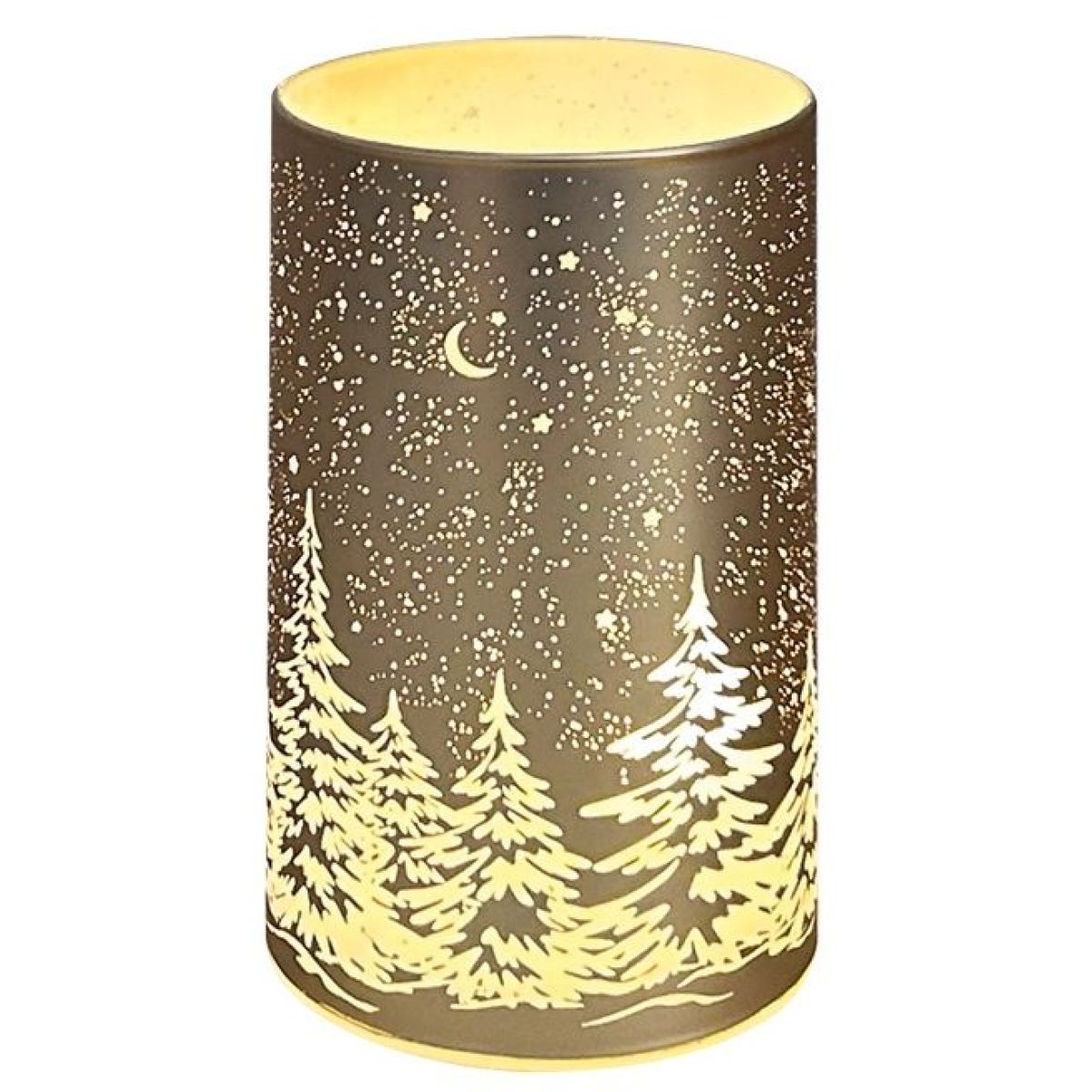 Anděl Přerov Svítící skleněný válec s motivem krajiny zlatý, 12,8 x 7,5 cm, teplá bílá, 10 LED, časovač