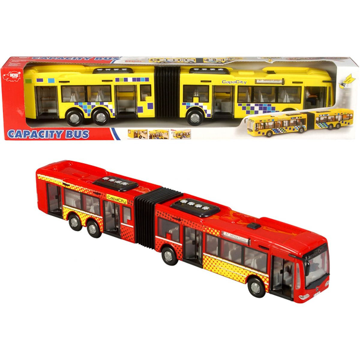 Autobus má otevírací dveře. Baterie jsou součástí balení. S figurkou, na setrvačník.