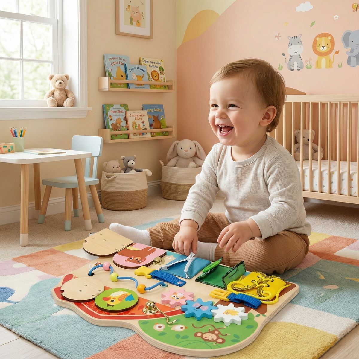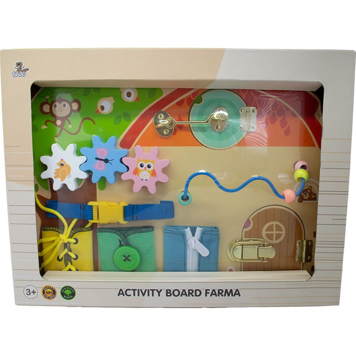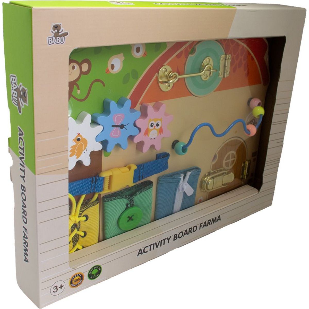 Babu Activity board Farma je dřevěná manipulační deska zaměřená na rozvoj jemné motoriky, koordinace ruka–oko a logického myšlení. Tematické zpracování farmy podporuje rozšiřování slovní zásoby i přirozenou dětskou zvídavost.