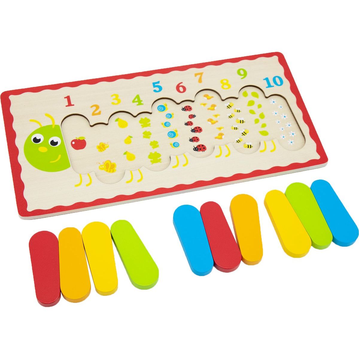 Barevná dřevěná skládačka ve tvaru housenky pomáhá dětem rozvíjet počítací schopnosti, logické myšlení a jemnou motoriku.