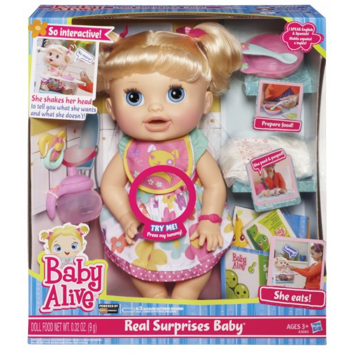 Panenka Real Surprises Baby otevírá a zavírá oči, umí říct 30 českých nebo slovenských frází a dokonce mamince řekne, až bude hladová. Stejně jako opravdové dítě je občas v jídle trochu vybíravá. Dokáže zavrtět hlavou a dát tak mamince najevo, co jí chutná a co ne! Panenka Real Surprises Baby se počůrává a pokakává a v balení jsou náhradní plenky, které můžete snadno vyměnit.