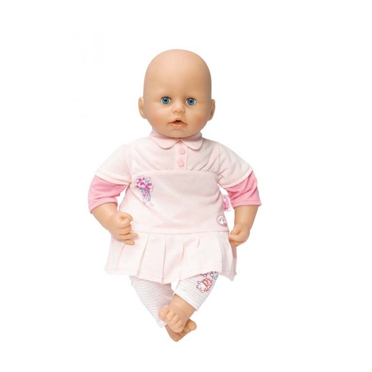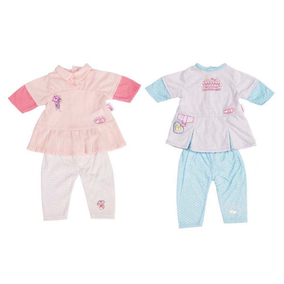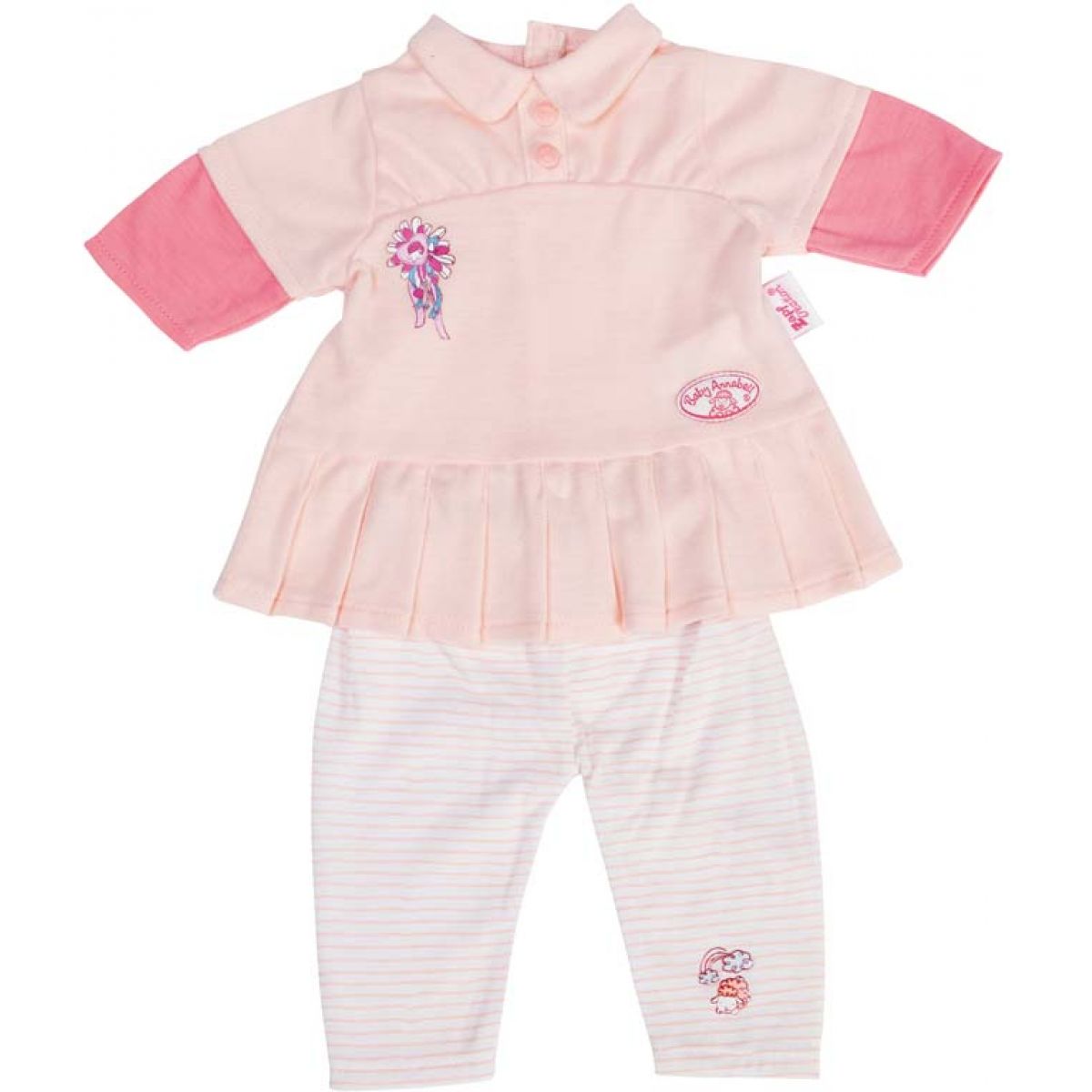 Šatičky pro Baby Annabell jsou dostupné ve dvou provedeních: růžové šatičky se světlými legínami nebo fialové šatičky a světle modré legíny.