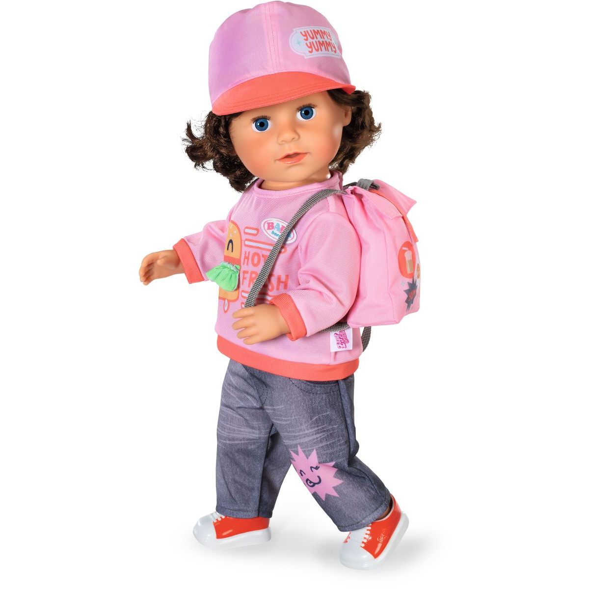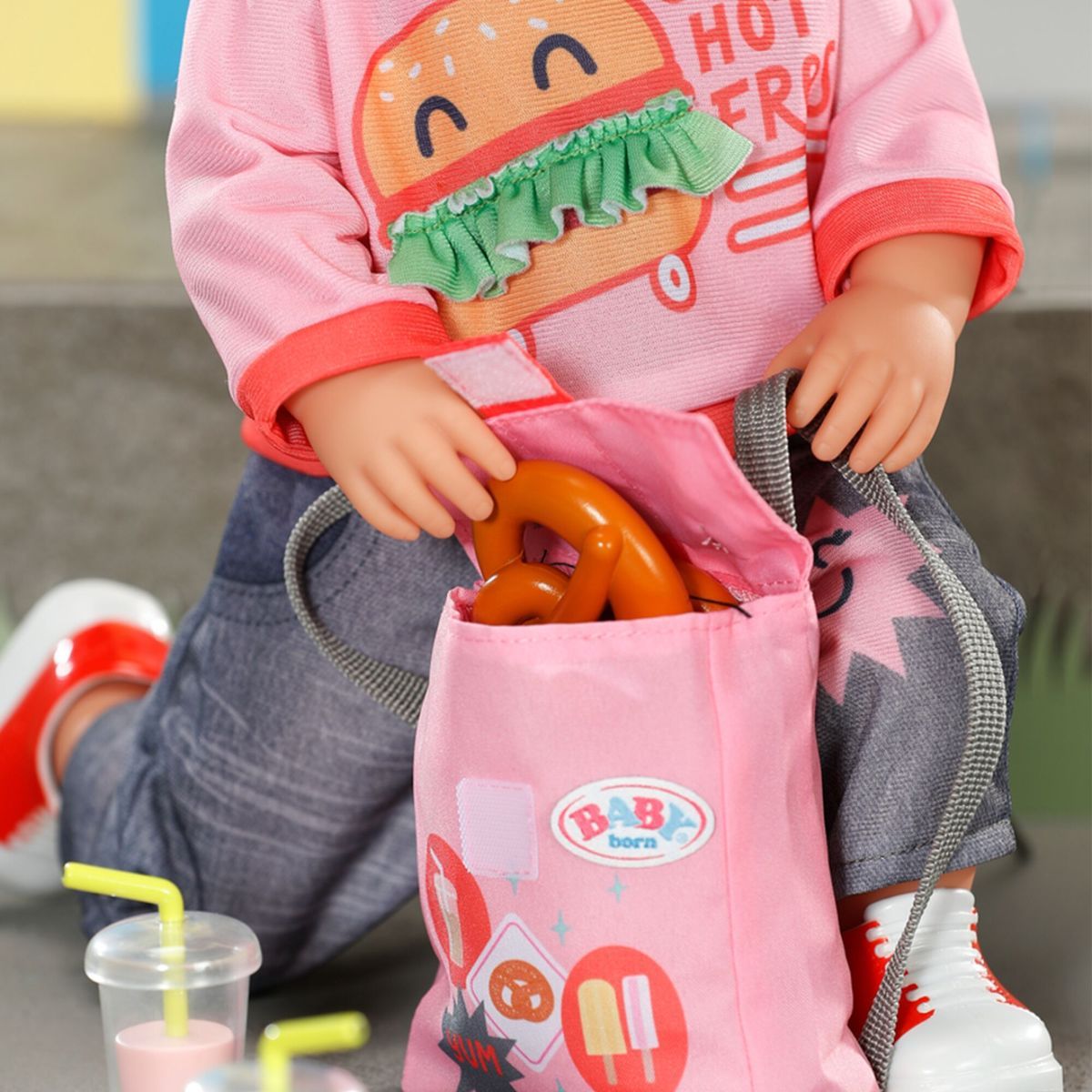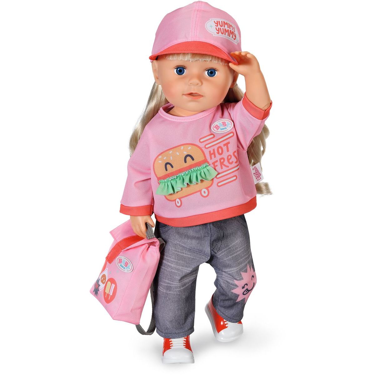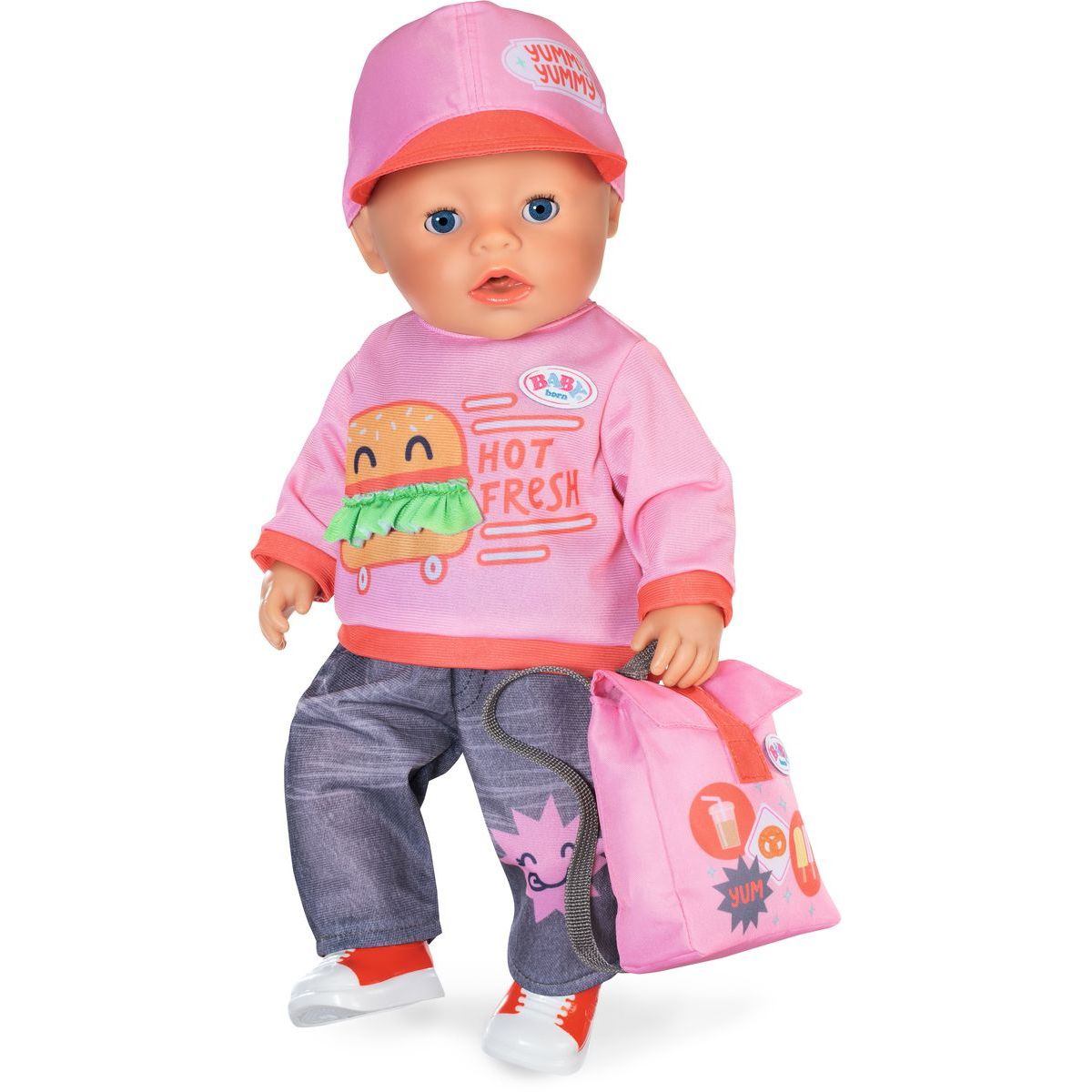 Vybavte svou panenku BABY born oblečením do města, které dokonale ladí s vozíkem na občerstvení! Tento stylový komplet obsahuje tričko s hravým potiskem burgeru, pohodlné džíny, boty, módní kšiltovku a praktický batoh s dostatkem místa pro rozvoz jídla a svačinek. Každý kousek je navržen tak, aby podpořil kreativitu a dlouhotrvající zábavu při hraní. Ideální outfit pro panenky velikosti 43 cm, který přináší šmrnc městského dobrodružství přímo do dětského pokoje. Užijte si hodiny plné her a nápaditých příběhů v autentickém stylu BABY born.