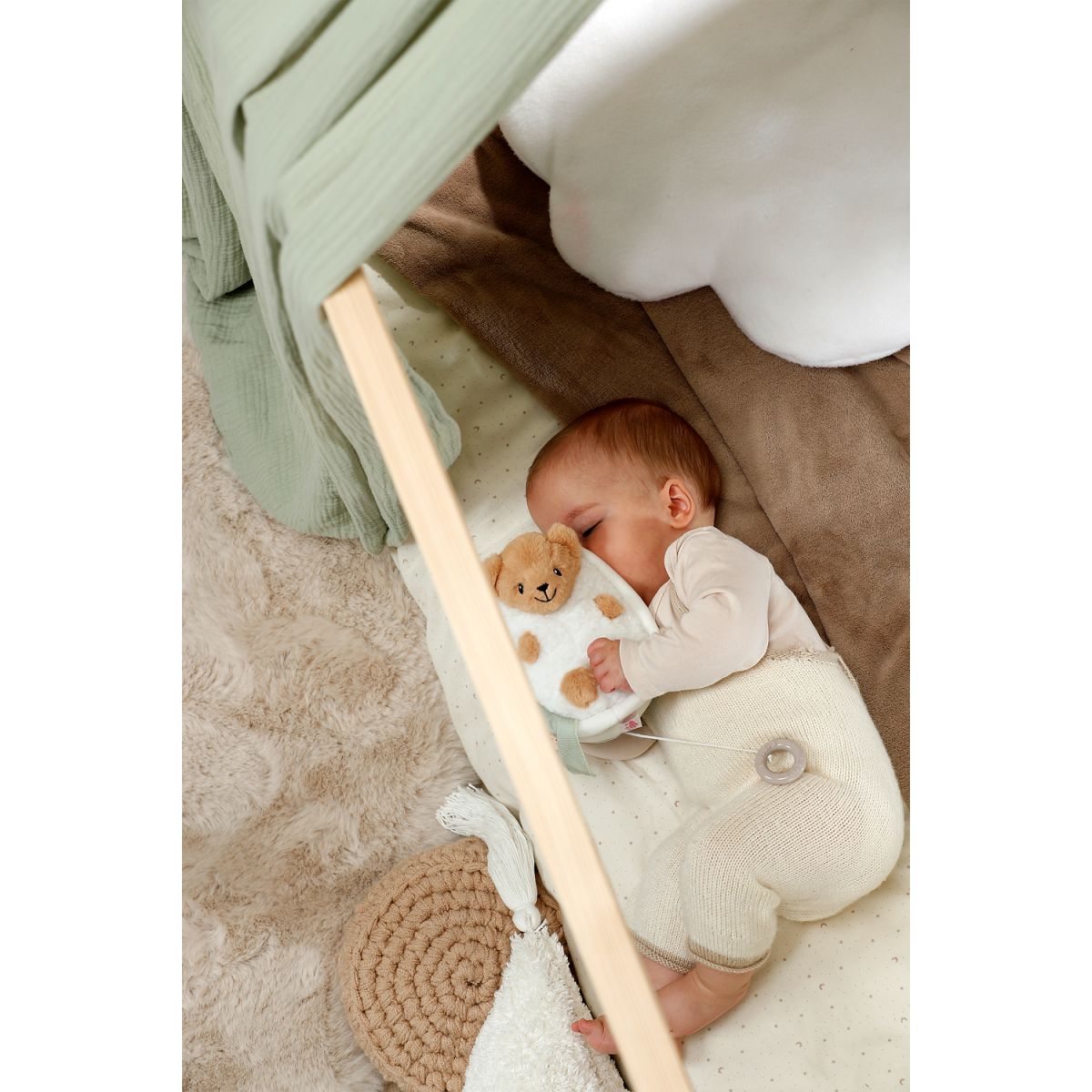 Tento plyšový medvídek se schovává ve své malé vaničce, která usnadňuje jeho přenášení a bezpečné uchování. Vyjímatelný hudební modul nabízí uklidňující melodii, která pomáhá navodit klidné večerní chvíle a podporuje rituály před spaním.