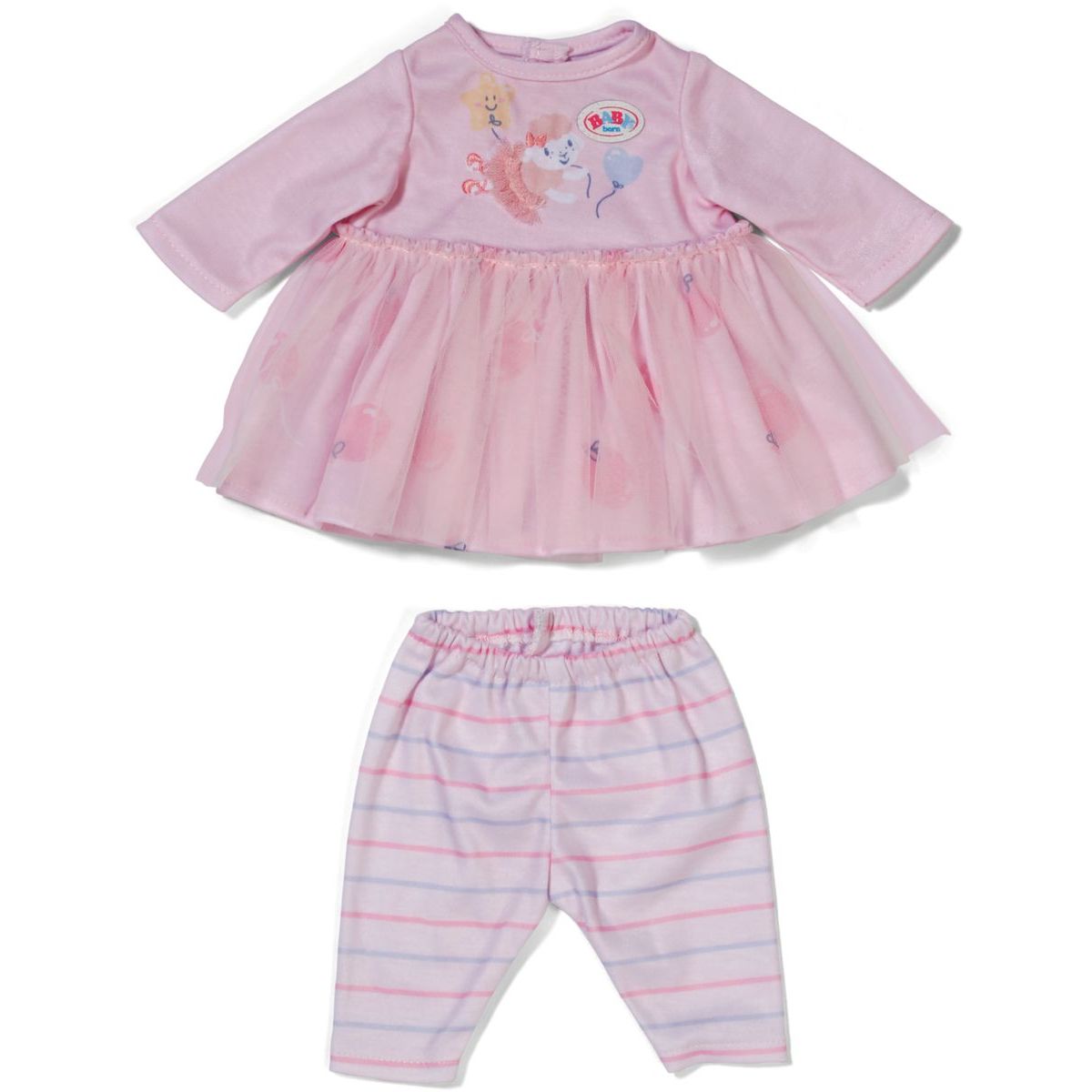 Vytvořte panence BABY born nezapomenutelný outfit, který kombinuje něžnost světle růžové barvy s hravostí tylové sukýnky a pruhovaných legín.