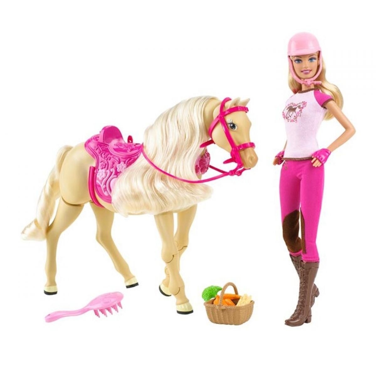 Nový chodící kůň s panenkou žokejky Barbie. V sadě nalezneš opravdu chodícího koně, panenku Barbie v žokejském oblečení s přilbou, hřebínek pro česání koně a košík se zeleninou.