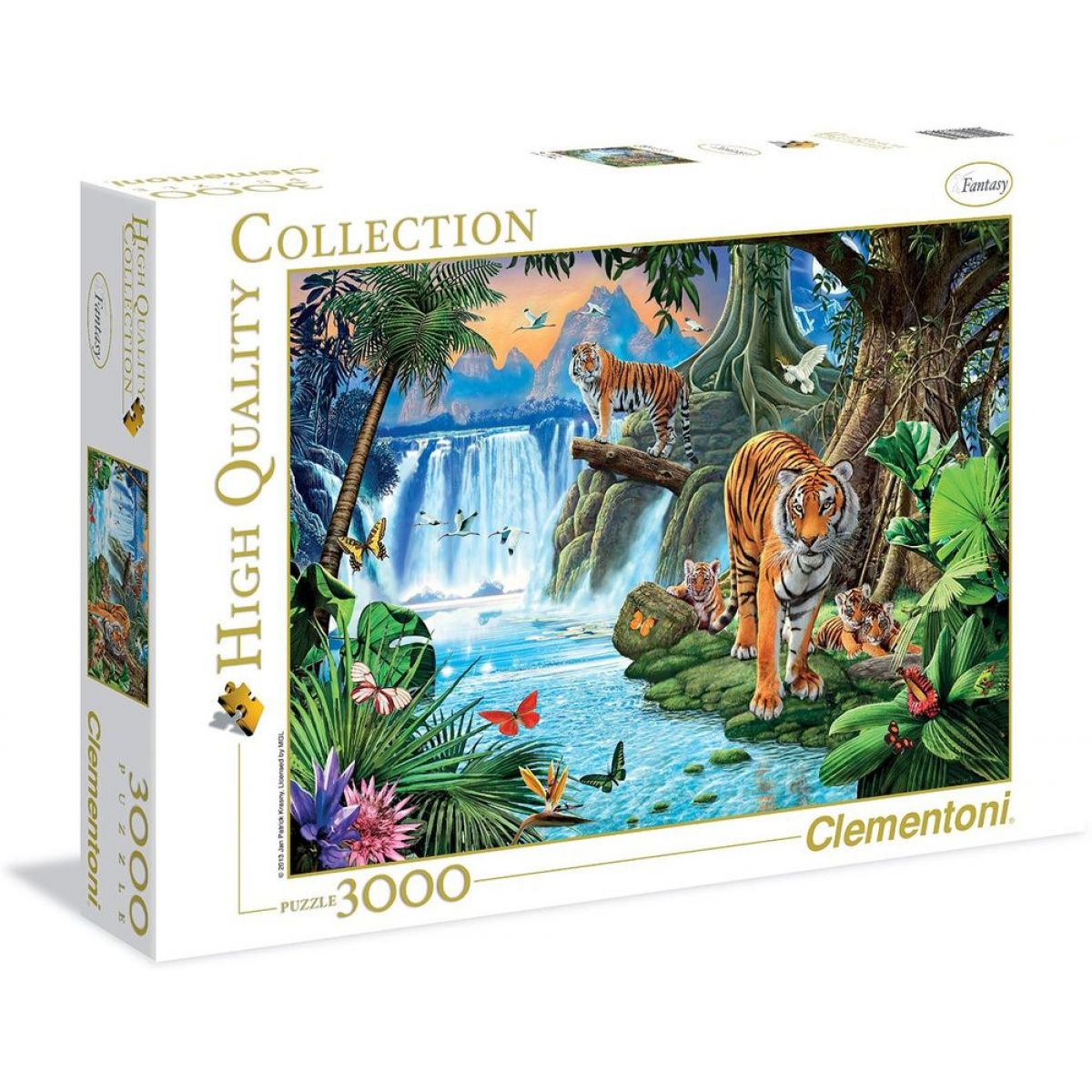 Kvalitní puzzle Clementoni High Quality Collection s motivem malované tygří rodinky u vodopádu.
