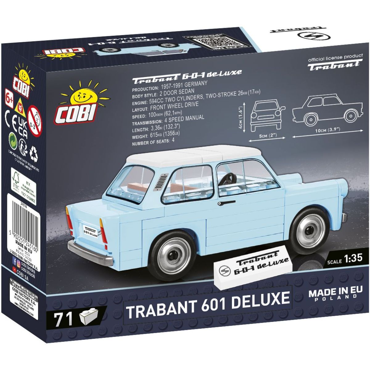Ponořte se do historie s modelem Cobi Trabant 601 Deluxe, ikonou automobilového designu z NDR. Tento detailní model v měřítku 1:35 vás zavede do světa legendárního vozu, který se vyráběl od roku 1964 až do roku 1990. Verze De Luxe z roku 1967 přináší nejen autentický vzhled, ale i fascinující technické detaily jako karoserii z materiálu Duroplast, který byl odolný proti korozi a měl vlastnosti podobné hliníku. Díky 71 dílkům stavebnice si můžete poskládat věrnou repliku tohoto klasického auta s malým dvoutaktním motorem a prostorným interiérem. Užijte si stavění i obdivování modelu, který stále fascinuje motoristické nadšence po celém světě.