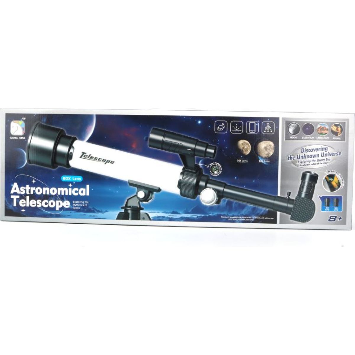 Tento dalekohled s 30× a 60× zvětšením ti přináší nádherný pohled na vzdálené objekty. S optickými čočkami a vysokým rozlišením si vychutnáš každý detail. Set obsahuje dalekohled, oční čočky (16,6 mm/8,3 mm), stativ, držák na mobilní telefon a hledáček – ideální pro všechny, kteří chtějí vidět víc a lépe.