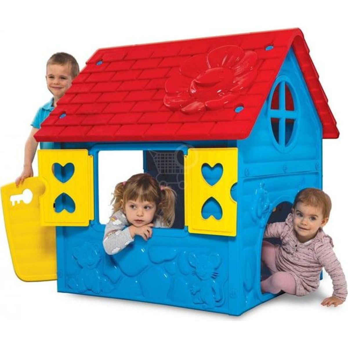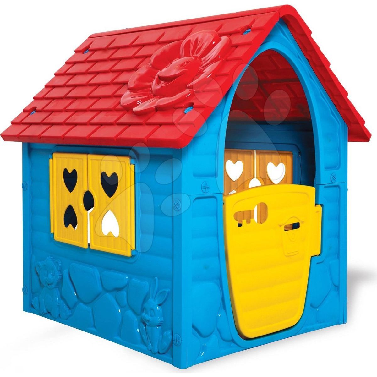 Stylový domek je vyhotoven v barevné kombinaci červené, žluté a modré. Skládá se z plastových stěn, střechy, uzavíratelných dveří a oken s okenicemi.
