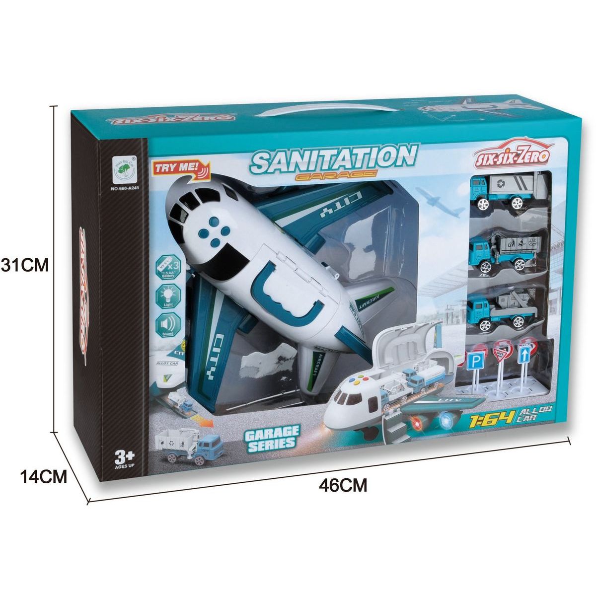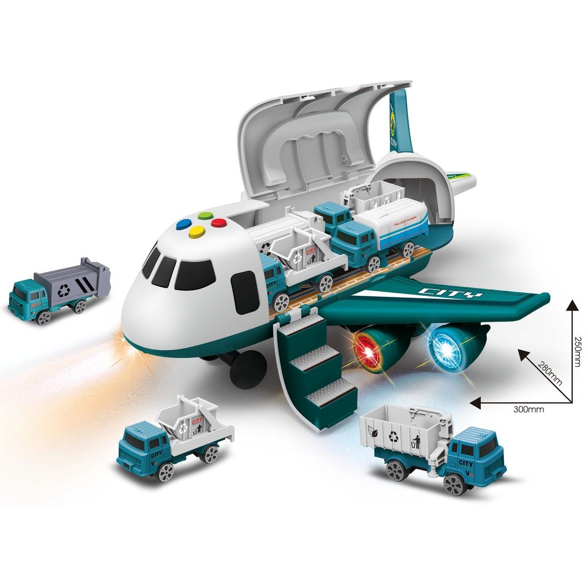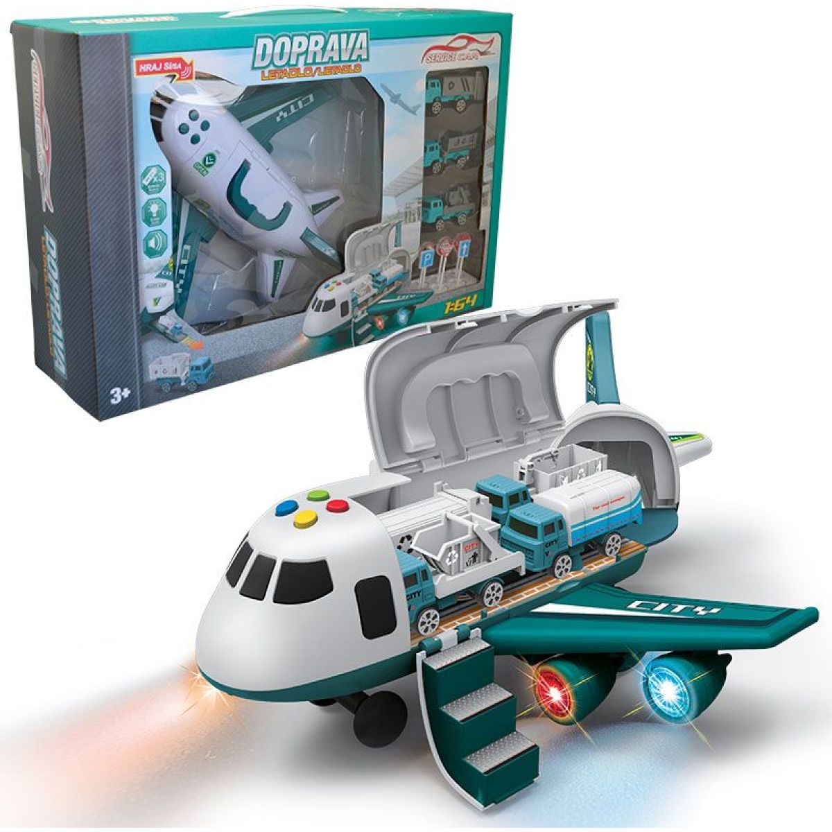 Detailně zpracovaná sada v měřítku 1:16 kombinuje model dopravního letadla s garáží a doplňky pro manipulaci s vozidly a nákladem.