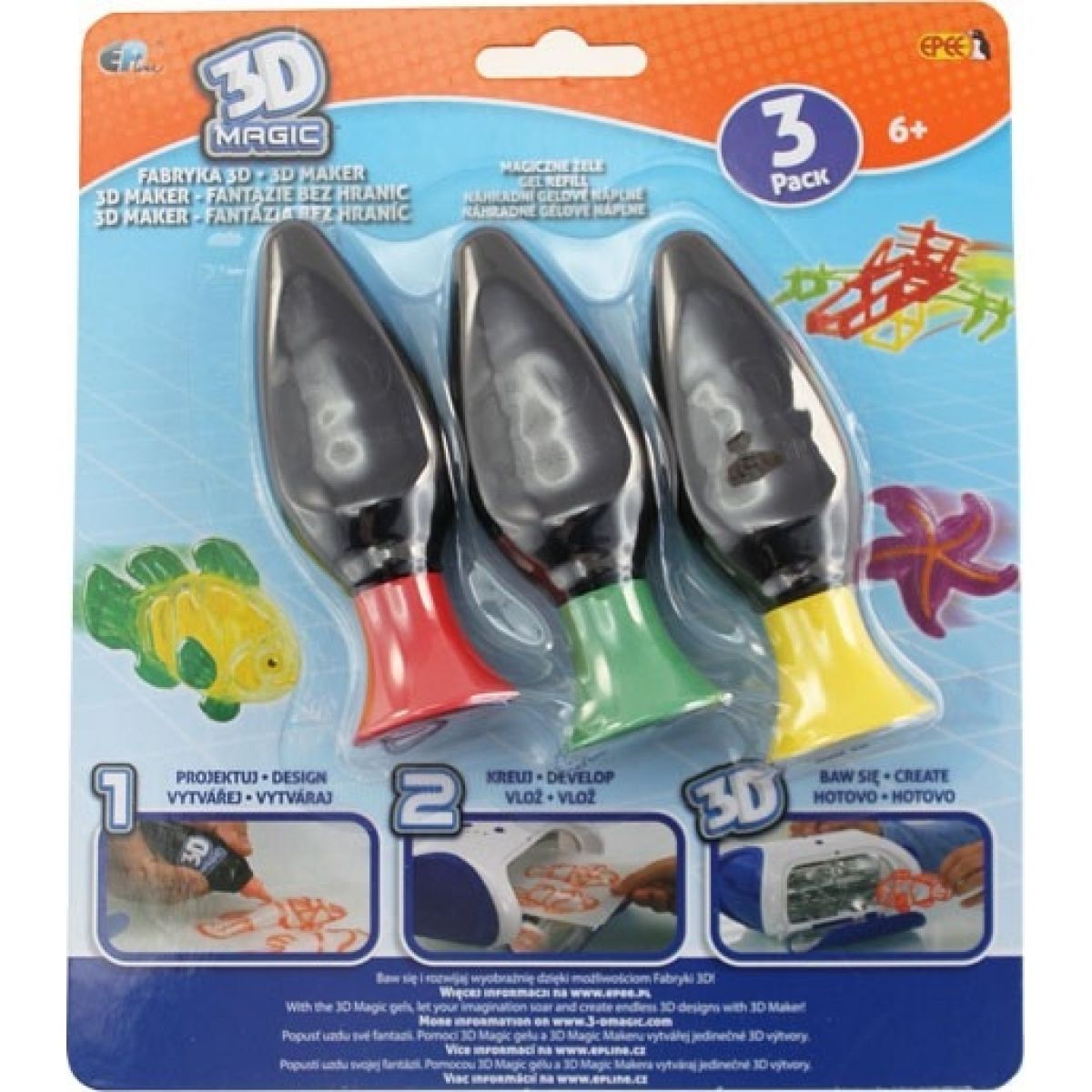 Jak to funguje? Naneste 3D Magic gel na formy nebo šablony a pak vše vložte do 3D Magic makeru. Působením UV záření Magic gel ztuhne a během několika minut vaše dílo promění v jedinečné 3D výtvory. Můžete je použít k dekoraci, sbírat nebo věnovat svým přátelům. Popusťte uzdu své fantazii a vytvářejte originální 2D i 3D výtvory! 3D Magic nezná hranice!