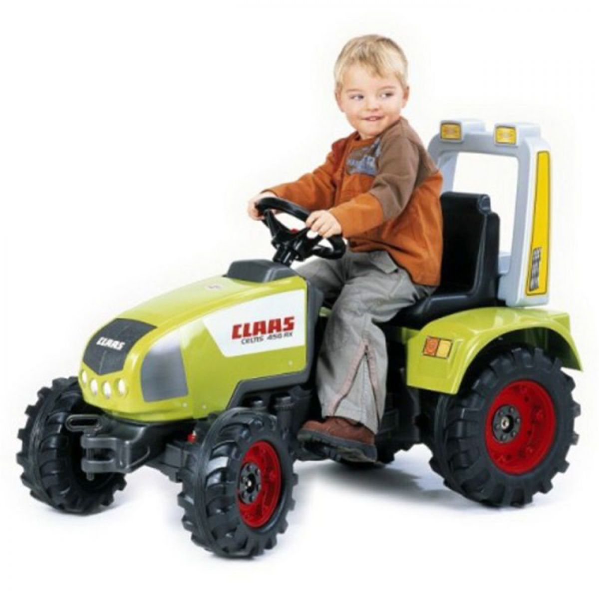 Plastový traktor zelené barvy "CLAAS Celtis 456 RX". Šlapací pohon je přenášen řetězovým převodem na zadní kolo