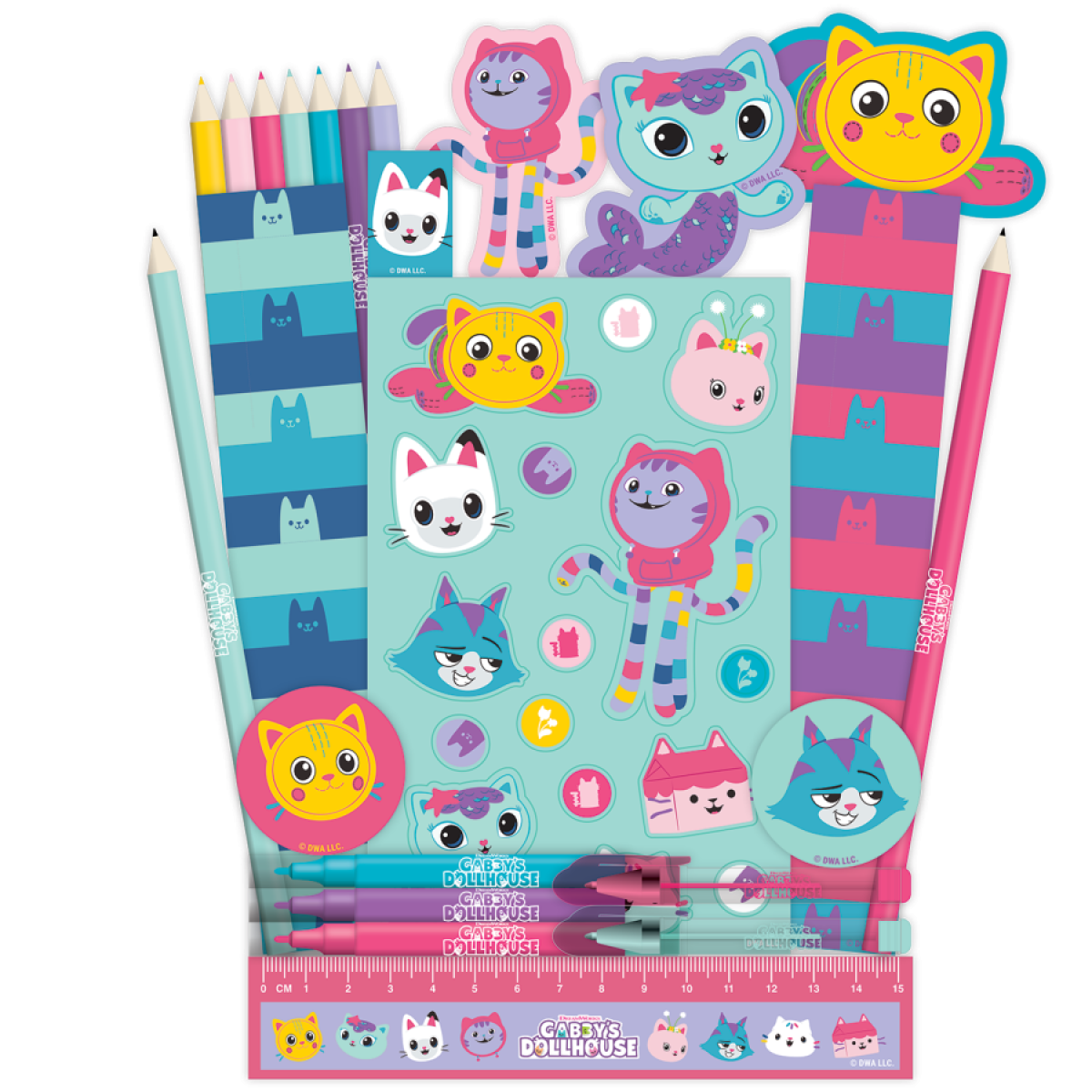 Obsah: 1× pravítko (15 cm), 1× ořezávátko, 2× gumy, 2× záložky, 3× mini vodové fixy, 7× mini pastelky, 2× mini gelová pera, 2× tužky HB, 3× magnetky, 1× arch se samolepkami.