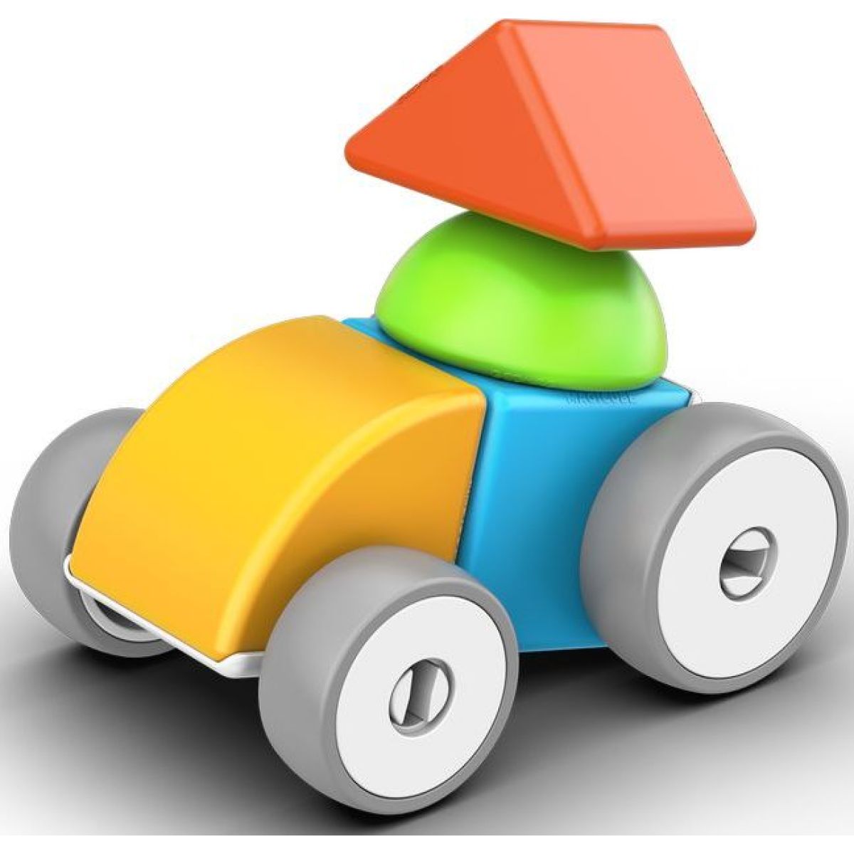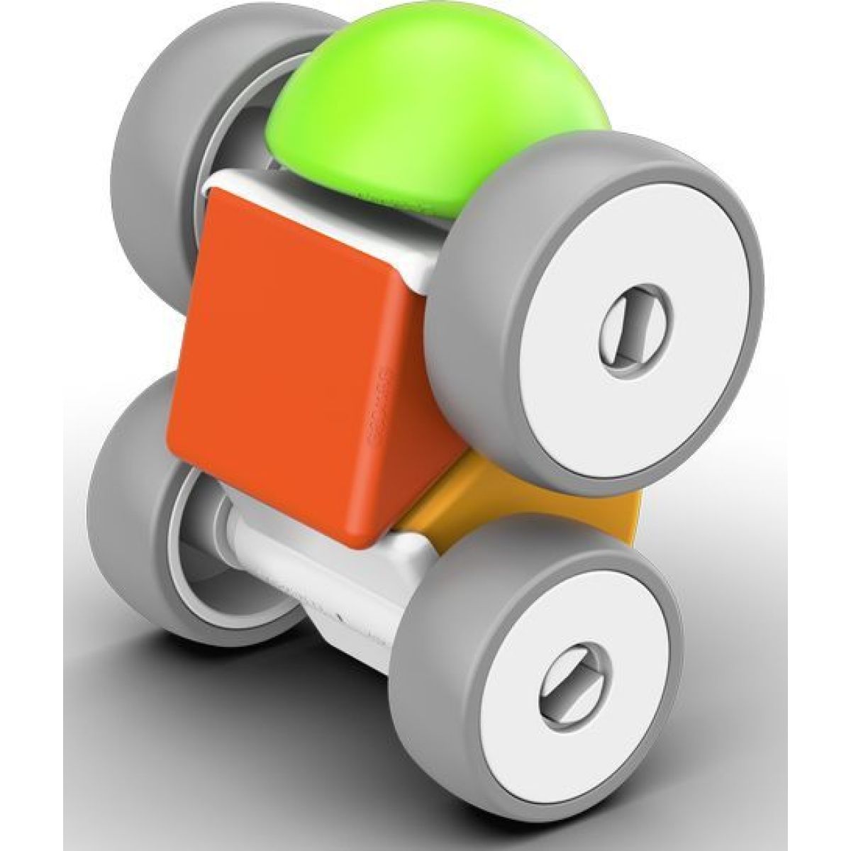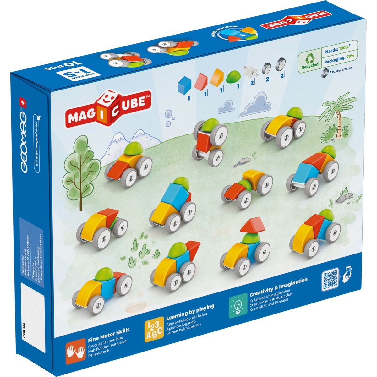 Magnetická stavebnice Geomag Magicube obsahuje 4 magnetické prvky různých tvarů a barev a 4 kolečka se dvěma podvozky. Ideální i pro malé děti již od 1 roku. Vyrobeno ve Švýcarsku, z recyklovaného plastu.