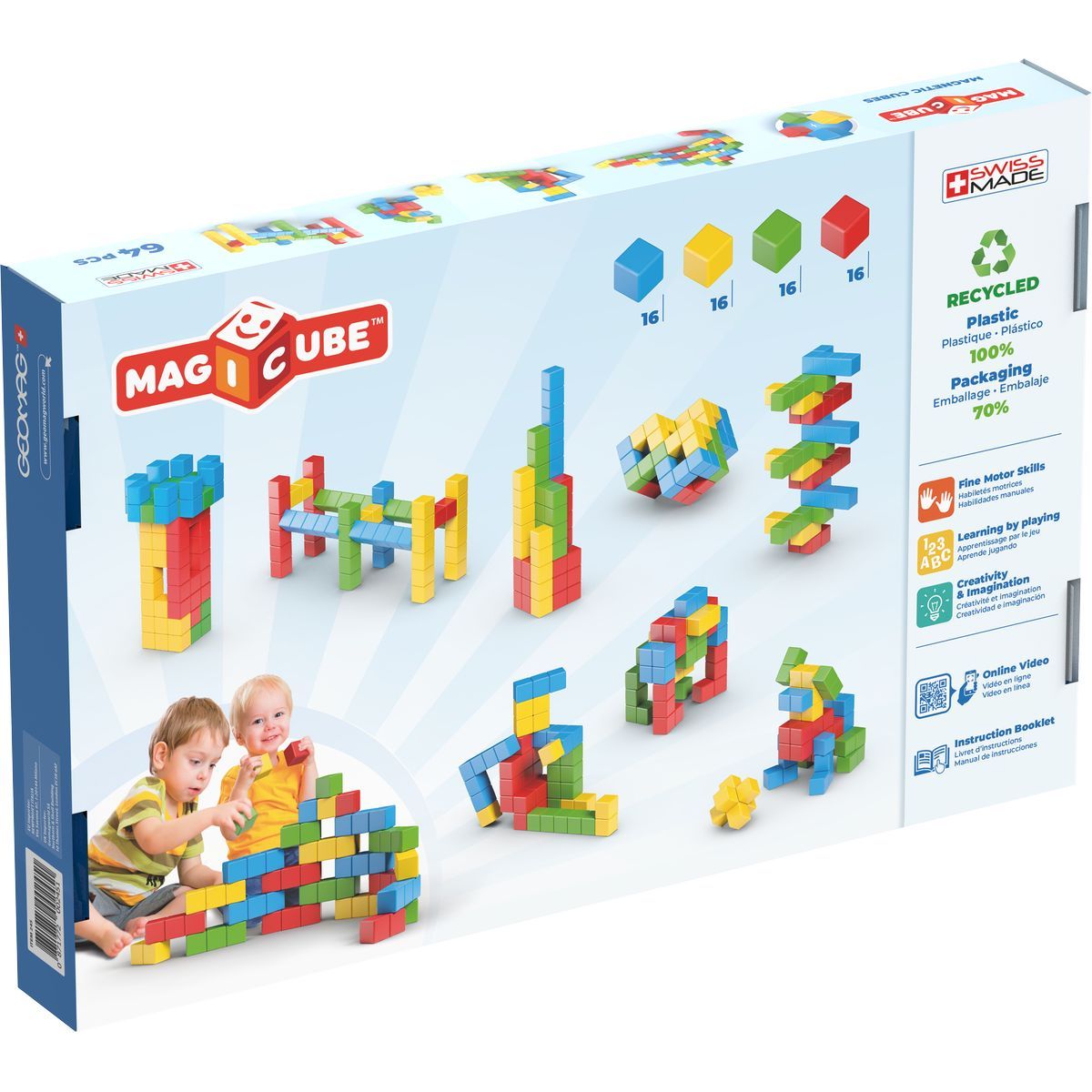 Díky speciální vnitřní konstrukci se magnetické kostičky přitahují ze všech šesti stran a drží i volně v prostoru - stavění ve 3D. Obsahuje 64 kostek ve čtyřech barvách. Vyrobeno ve Švýcarsku ze 100% recyklovaného plastu. Vhodné od 1 roku.