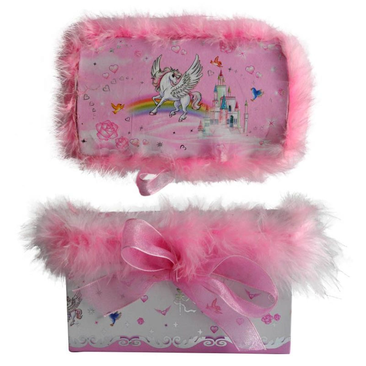 Šperkovnice s motivem Kouzlo Pegasů z dívčí sady. Truhlička má jemný design v růžovo-bílé barvě a je ze všech stran ozdobená pohádkovým motivem a stříbrným lemováním. Dětské šperky již budou vždy uklizené.