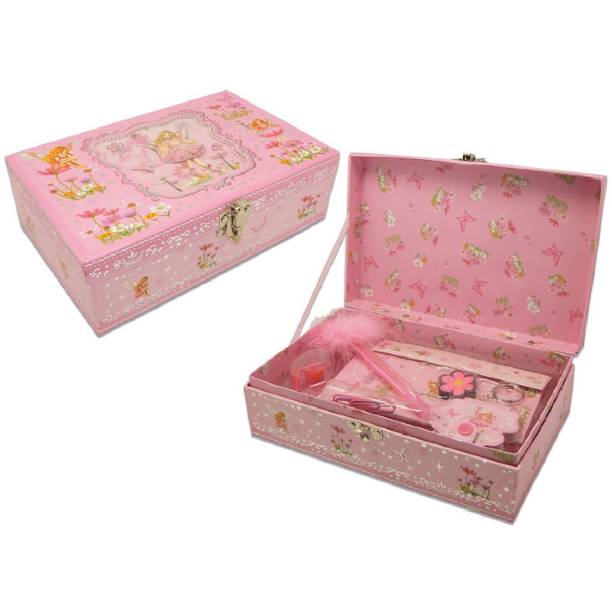Truhlička má jemný design v růžové barvě. Ze všech stran je ozdobená pohádkovým motivem, třpytkami, kamínky a stříbrným potiskem.