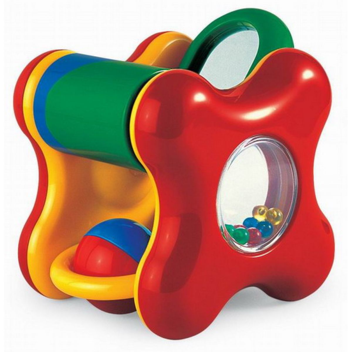 Malé aktivní centrum s velkým přínosem pro rozvoj dítěte s chrastícím barevným válcem,kuličkou,otočným zrcátkem a zrcátkem s kuličkami.
