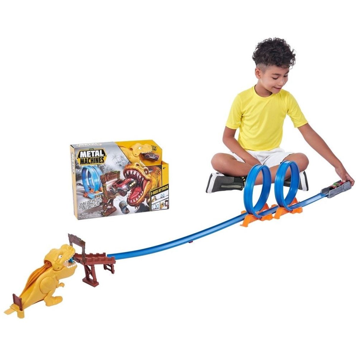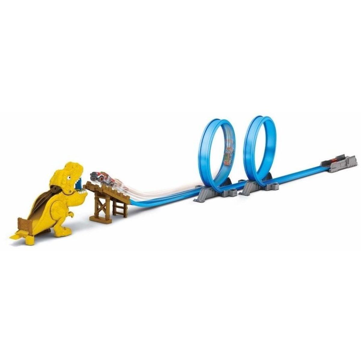 Hrací sada s dráhou, T-Rexem a kovovým autíčkem je akční herní set určený pro děti, které milují rychlost, překážky a dobrodružství. Playset T-Rex nabízí dynamickou závodní dráhu s výkonným odpalovačem, díky kterému autíčko dosahuje vysoké rychlosti a překonává překážku v podobě T-Rexí hlavy. Kovové autíčko zajišťuje vyšší odolnost při hře a pevná konstrukce dráhy umožňuje opakované sestavování. Sada podporuje rozvoj koordinace, logického myšlení a motorických dovedností dětí.
