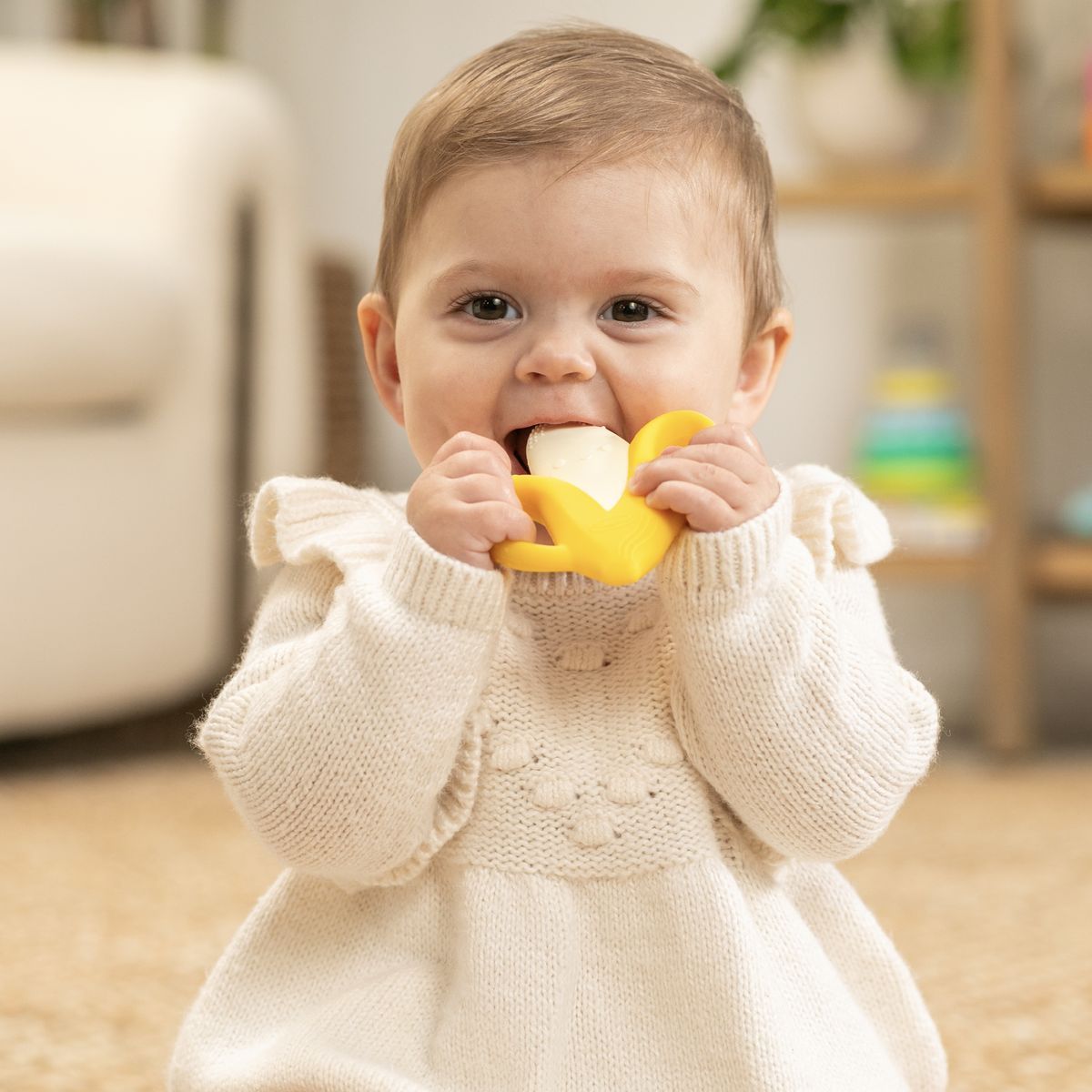Roztomilé kousátko ve tvaru usměvavého banánu je vyrobeno z měkkého a pružného silikonu, který je bezpečný a šetrný k dětským dásním. Různorodé textury na povrchu kousátka lákají děti ke zkoumání a pomáhají při prořezávání prvních zoubků. Díky ergonomickému tvaru je snadno uchopitelné malými ručičkami. Kousátko má rozměry 83 x 99 mm a neobsahuje BPA, což zaručuje bezpečnost a kvalitu.