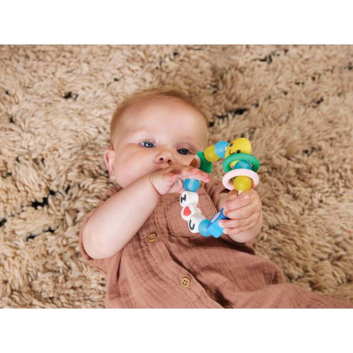 Krásné kousátko ve tvaru náramku je vyrobeno z pružného a měkkého silikonu, který je bezpečný a příjemný na dotek. Různorodé textury kousátka lákají dítě ke zkoumání v ústech a masírováním dásní pomáhají při prořezávání prvních zoubků. Díky ergonomickému tvaru je snadno uchopitelné malými dětskými ručičkami. S průměrem 11 cm je ideální velikostí pro malé ruce a neobsahuje BPA, což zajišťuje bezpečnost vašeho dítěte.