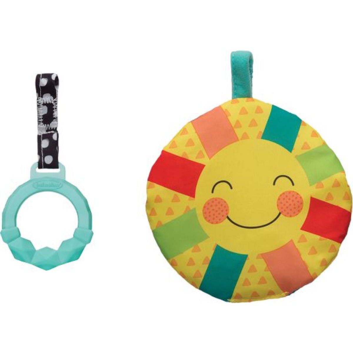 Odnímatelné hračky včetně kousátka je možné připevnit na různá místa na polštářku.