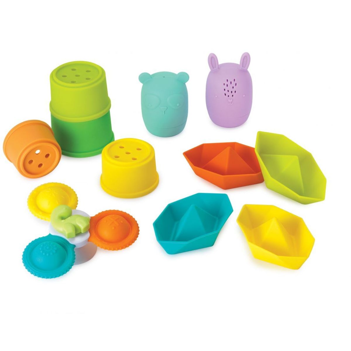 Infantino Sada hraček do koupele Spin, Squirt & Sail je barevná a stimulující sada 11 měkkých silikonových hraček určená pro rozvoj motoriky, koordinace a fantazie dítěte při hře ve vodě. Sada obsahuje stabilizační kelímky, malé plovoucí a stohovatelné lodě, vodní zvířátka, která stříkají vodu, a vířivou spinner hračku, která vytváří fascinující proudy vody. Hračky jsou vyrobeny z měkkého a bezpečného silikonu, snadno se uchopují a snadno čistí.