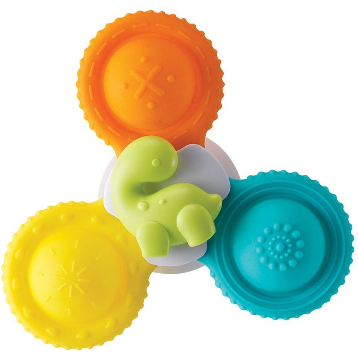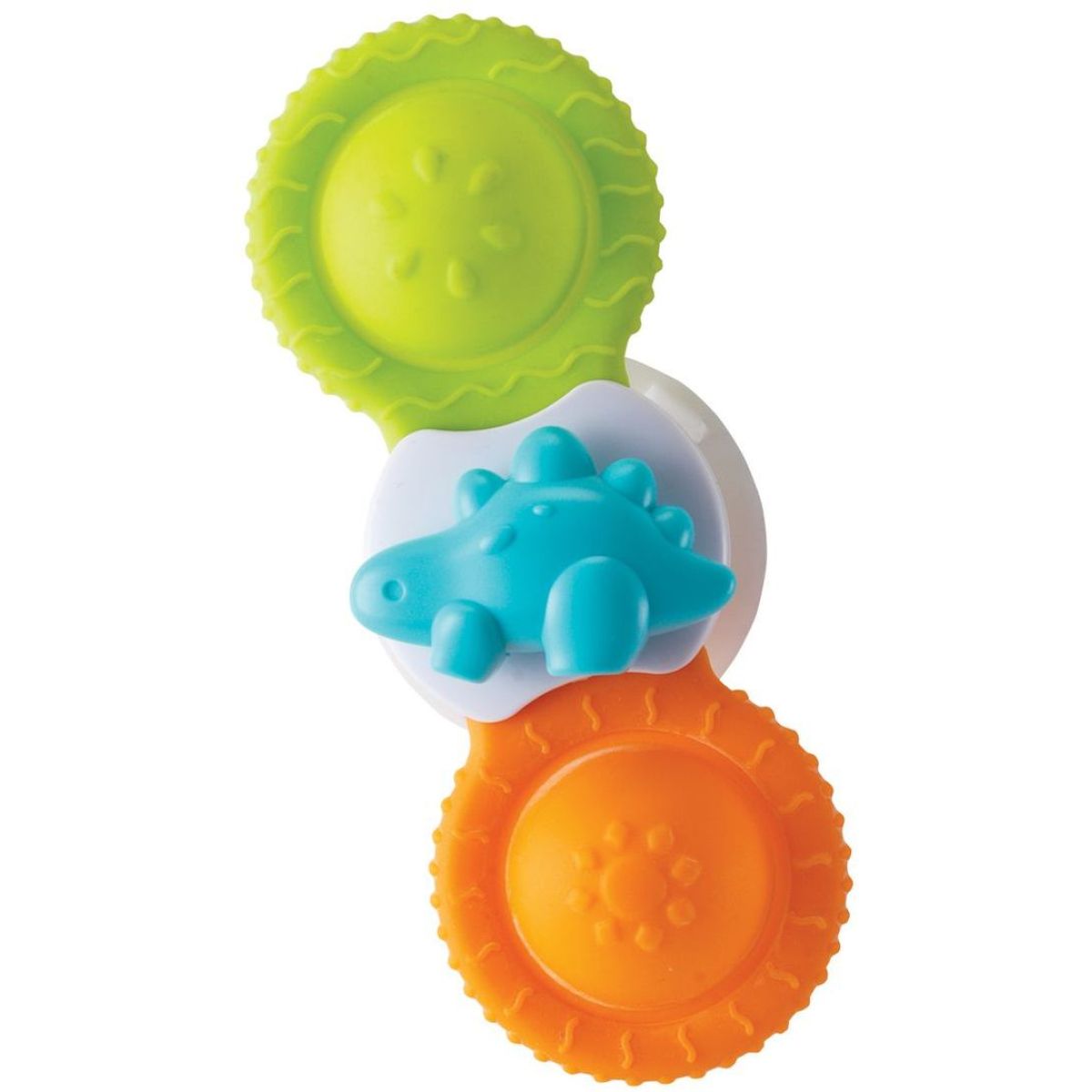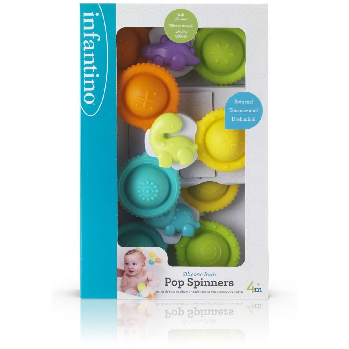 Infantino Spinner do koupele Pop Spinners 3 ks je sada tří barevných spinnerů s přísavkou, které přinášejí zábavu a podporují rozvoj jemné motoriky a smyslové koordinace dítěte při koupání. Spinner stačí připevnit na vanu a otáčet jednotlivě. Každý spinner má střed s postavičkou dinosaura a je vyroben z jemného, bezpečného silikonu vhodného pro malé děti.