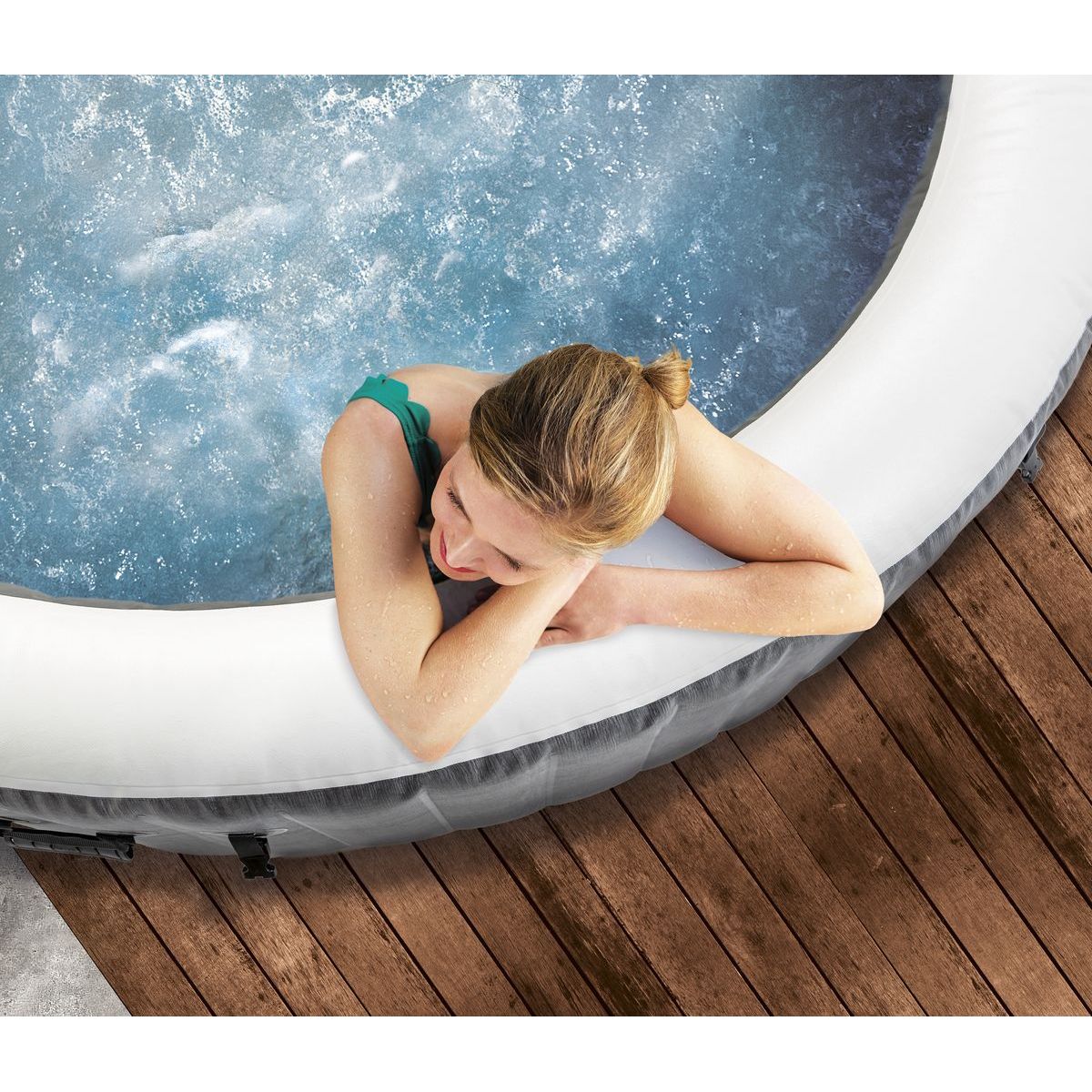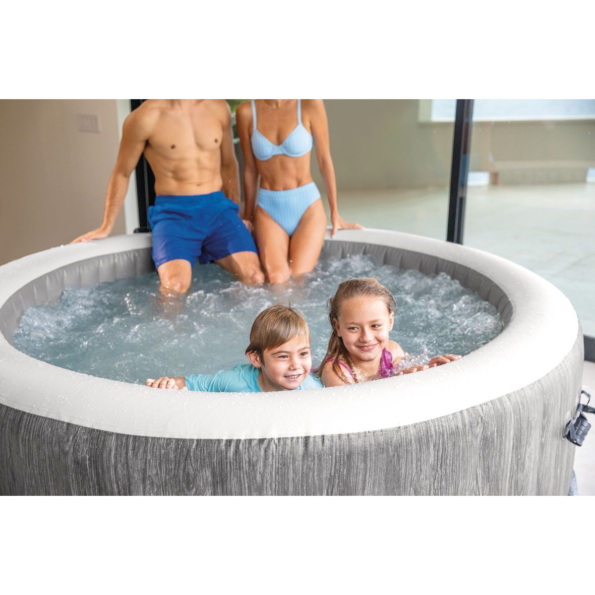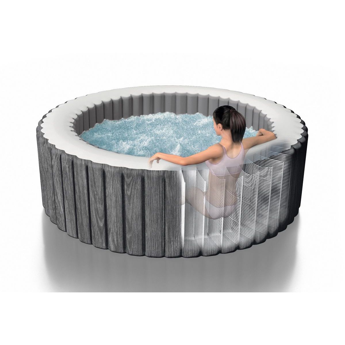Nafukovací vířivka Intex 28442NP PureSpa™ Greywood Bubble Deluxe je určena pro komfortní relaxaci až šesti osob. Elegantní šedý dekor s imitací dřeva umožňuje přirozené začlenění do zahrady, na terasu i prostornější balkon. Konstrukce využívá technologii Fiber-Tech™, která zajišťuje vysokou pevnost stěn a stabilitu i při plném napuštění.