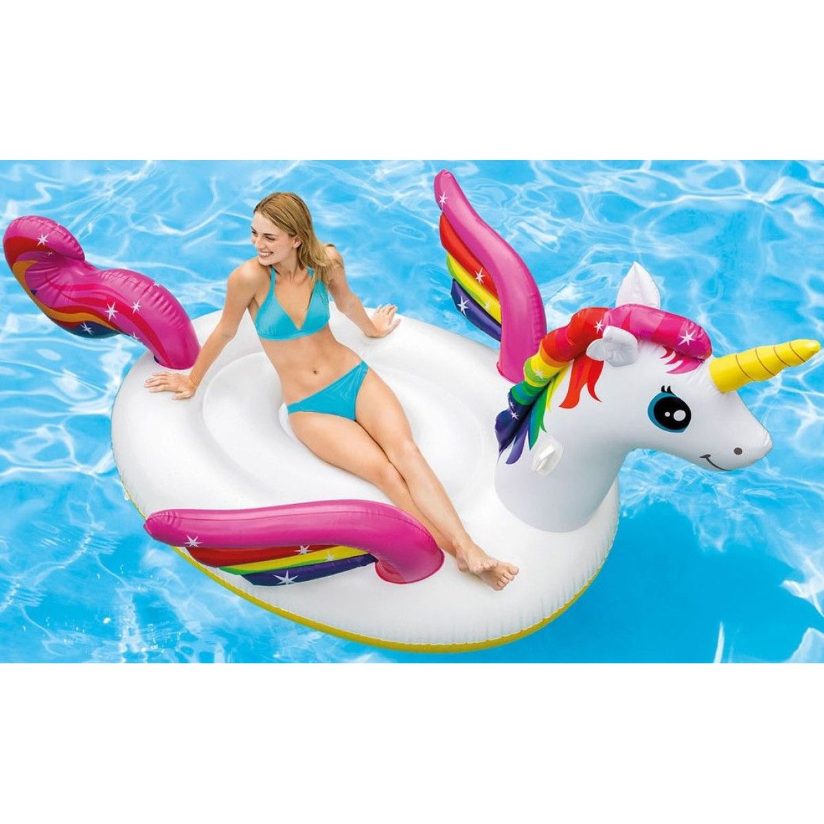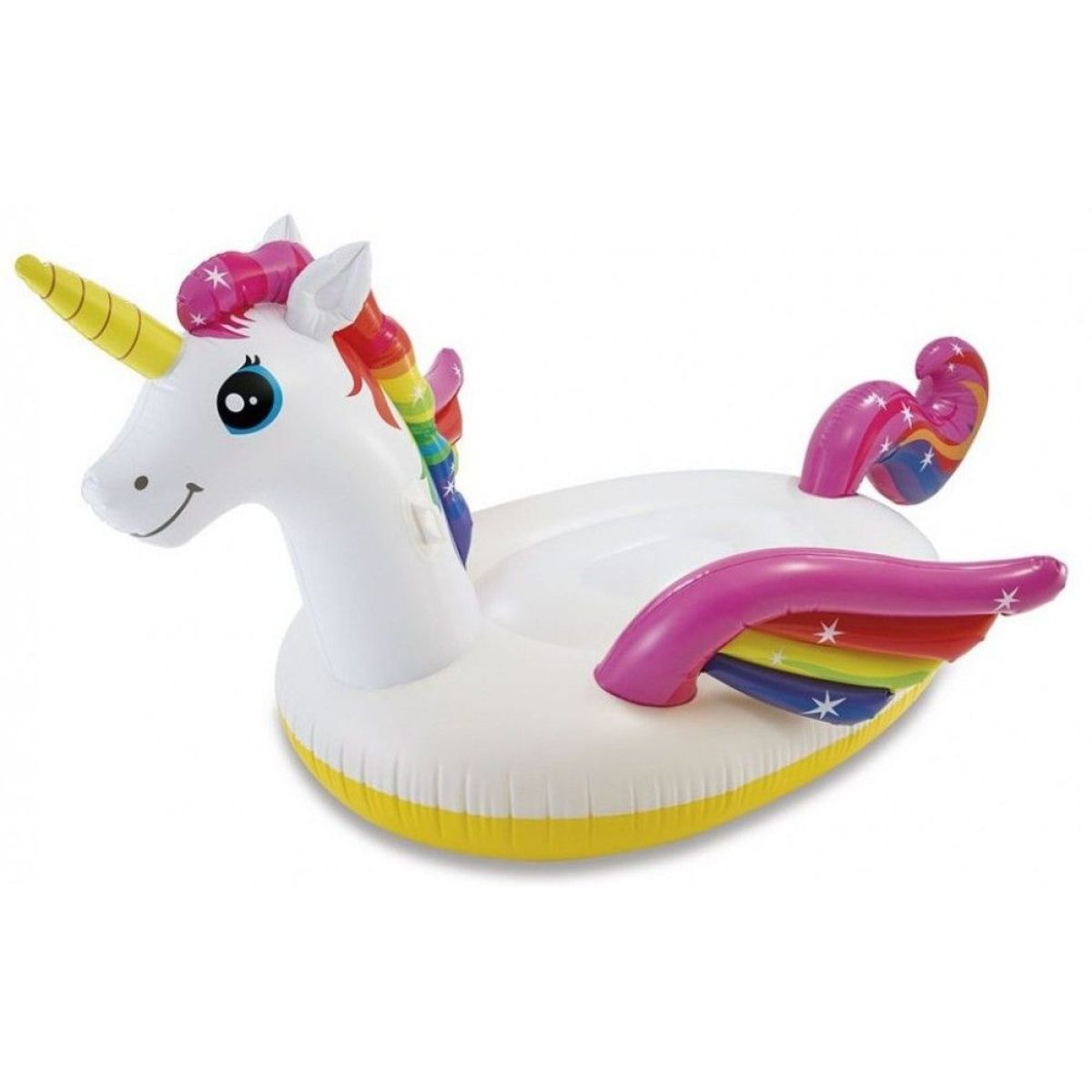 Nafukovací ostrov Intex ve tvaru jednorožce o rozměrech 2,51 × 1,63 × 1,45 m je určen pro jízdu, relaxaci i zábavu na vodní hladině.