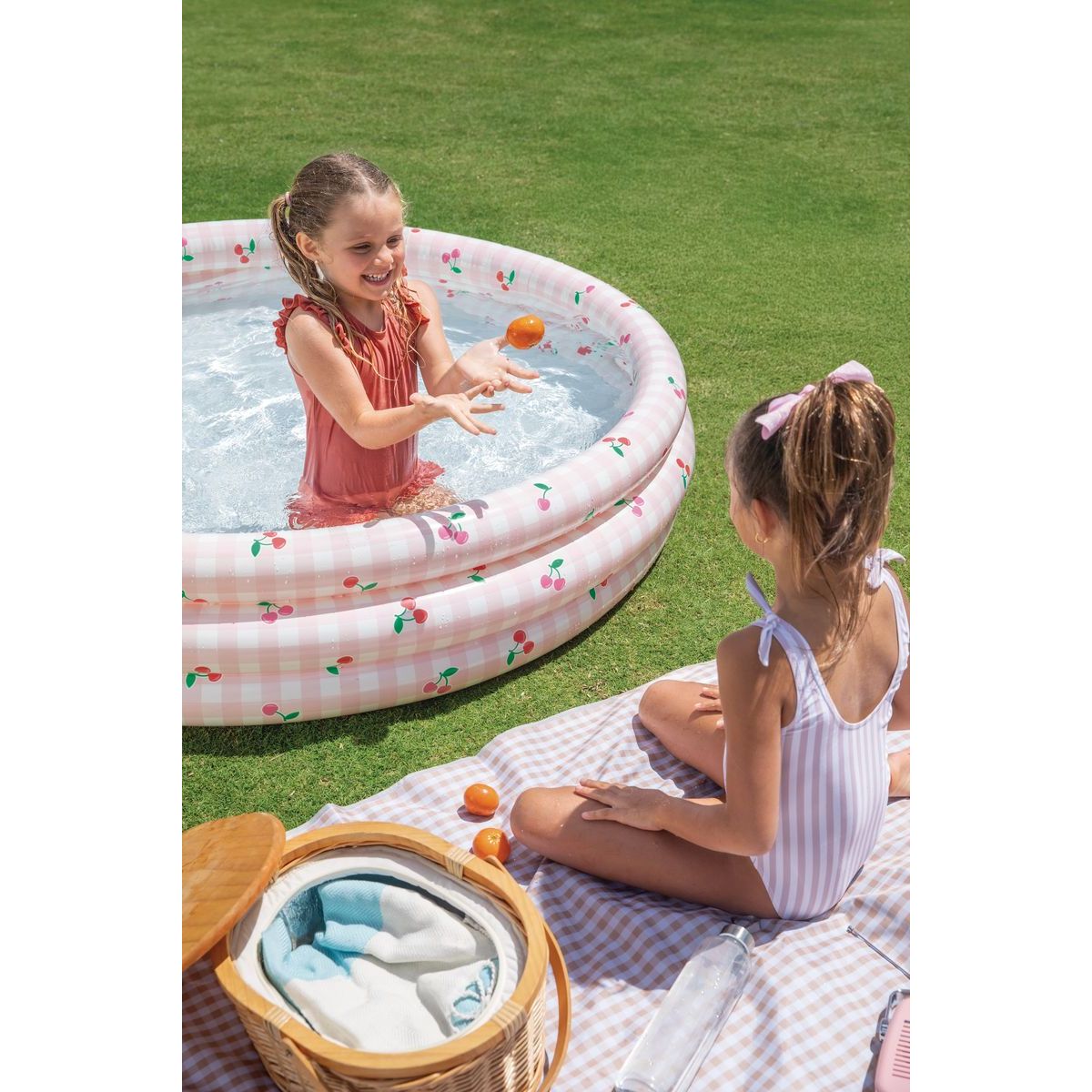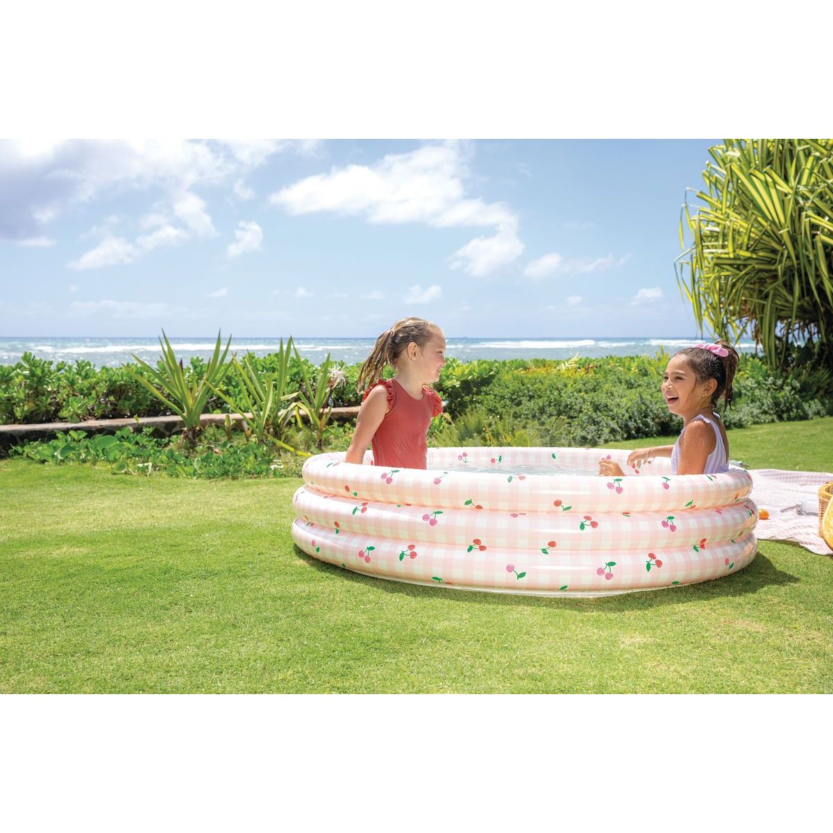 Velký, žlutý bazén pro zábavu i odpočinek na zahradě. Dětský bazén má tři nafukovací kruhy a dno s motivem citronu. Součástí opravná náplast.