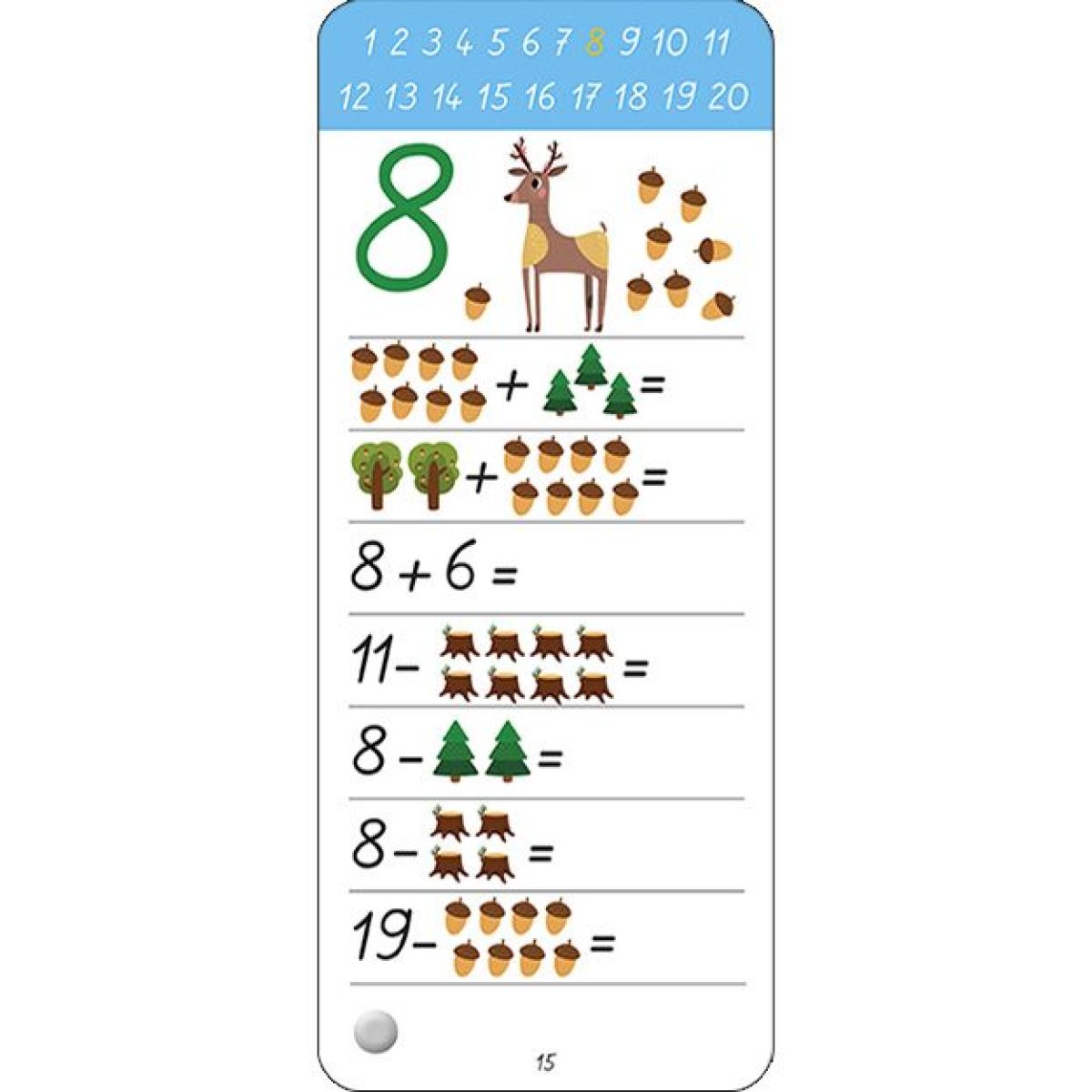 Edukační sada obsahuje 20 oboustranných stíratelných kartiček zaměřených na procvičování základních početních operací – sčítání a odčítání.