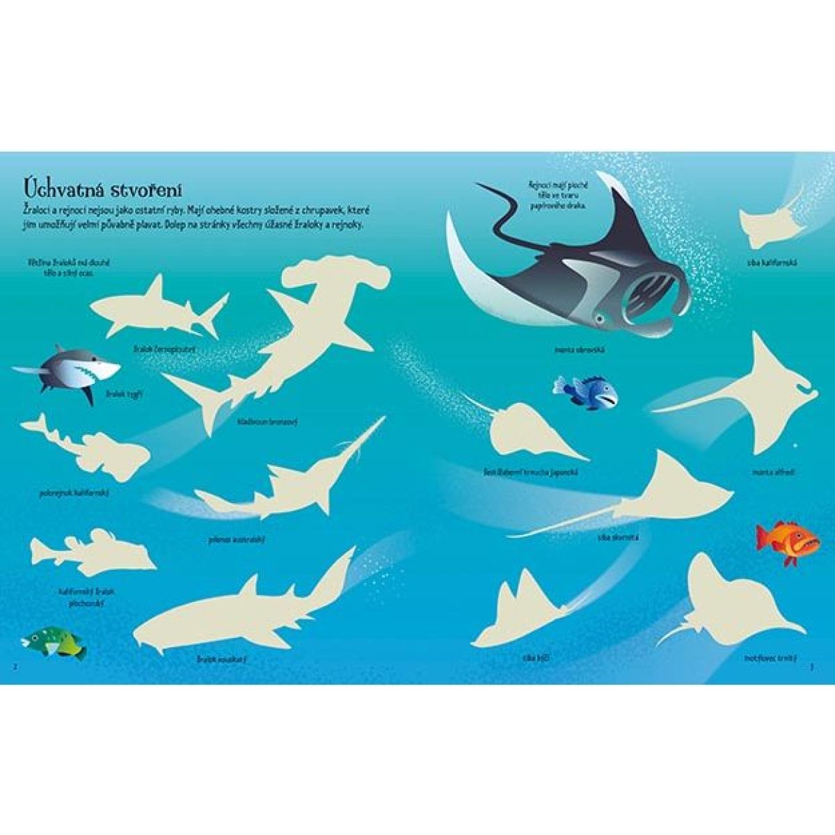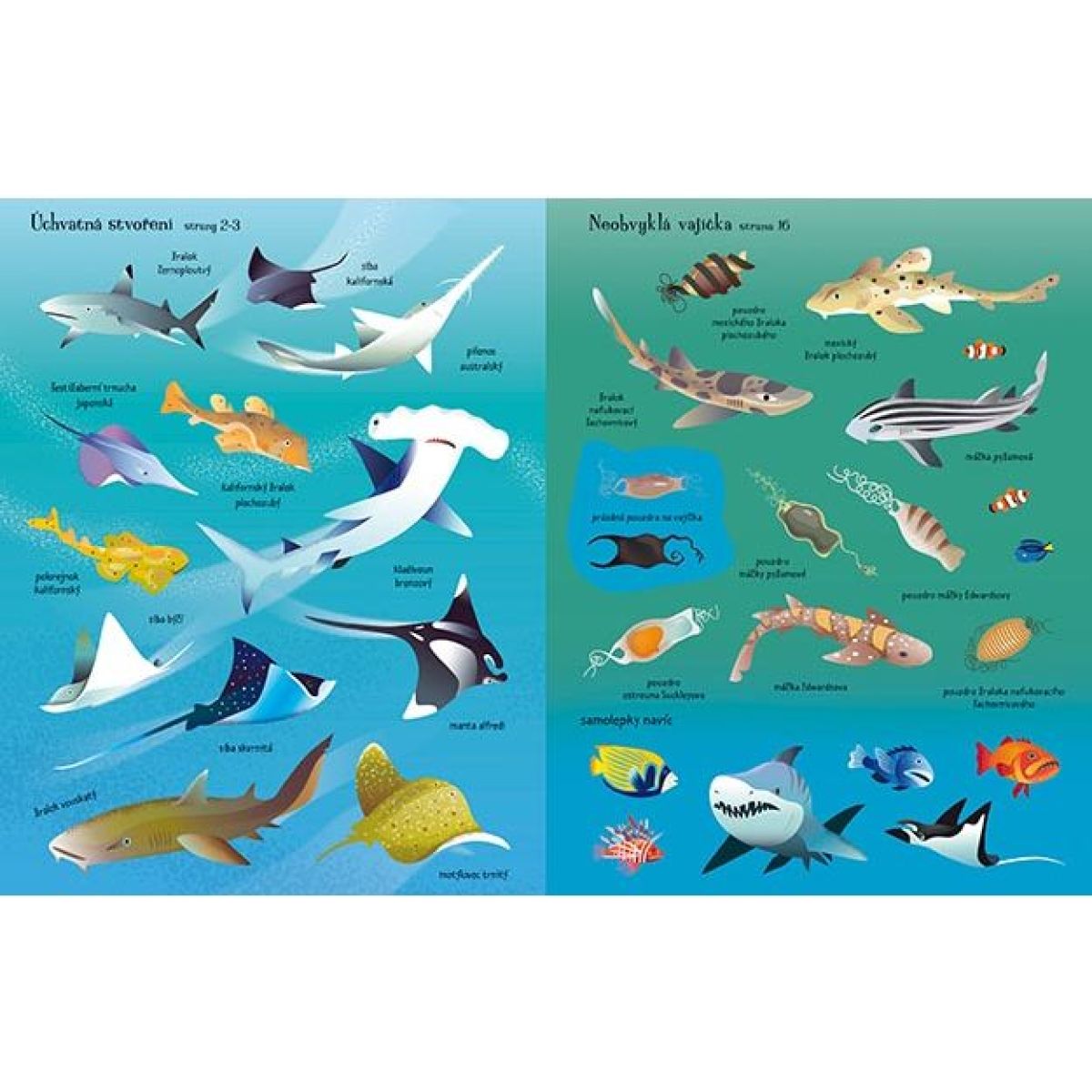 Samolepková knížka obsahuje 16 barevných stran s ilustracemi žraloků a rejnoků a 8 stran samolepek k dolepení.