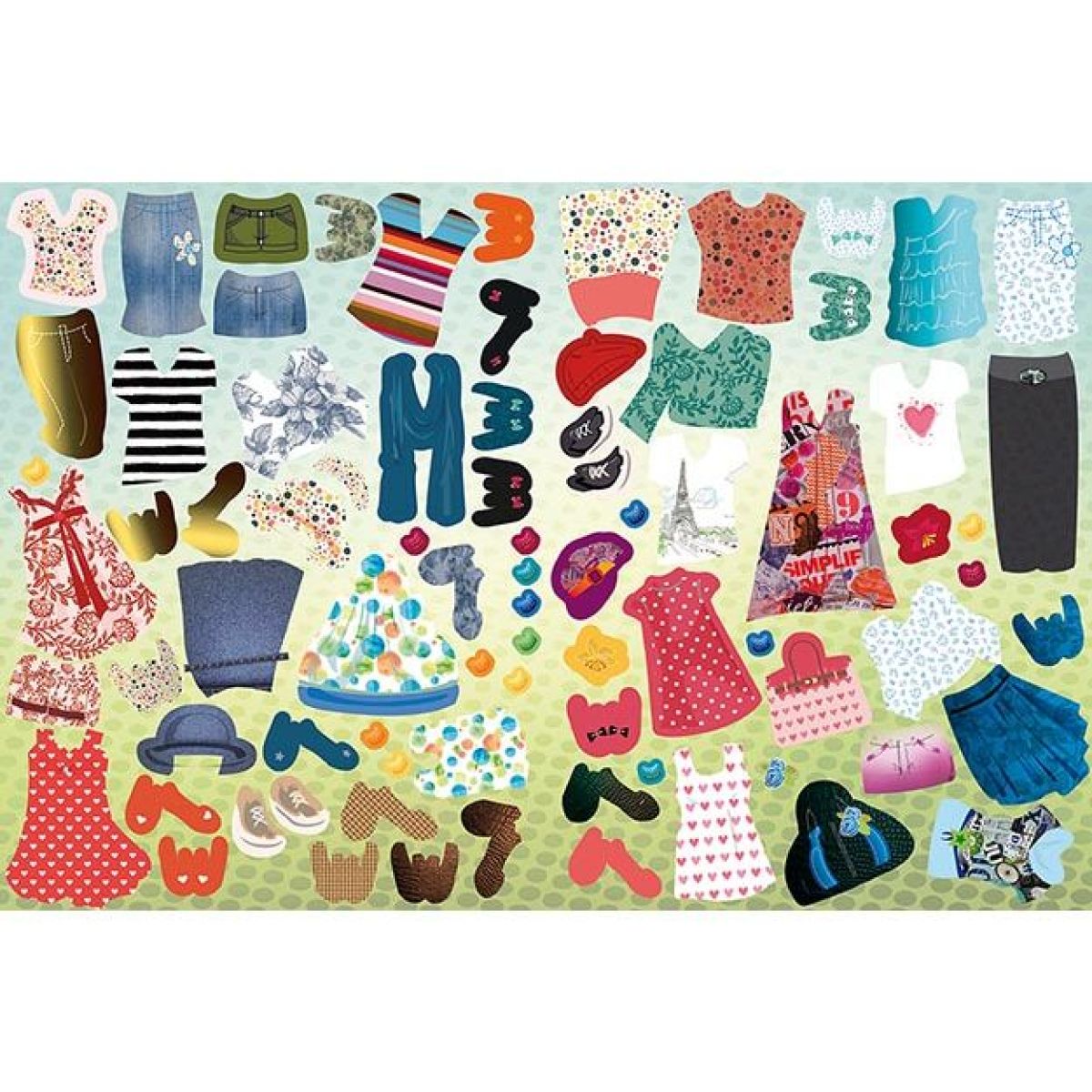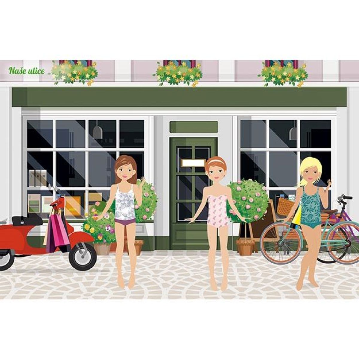 Samolepková knížka obsahuje 24 stran s motivy městského života a více než 300 samolepek šatů, bot a doplňků.