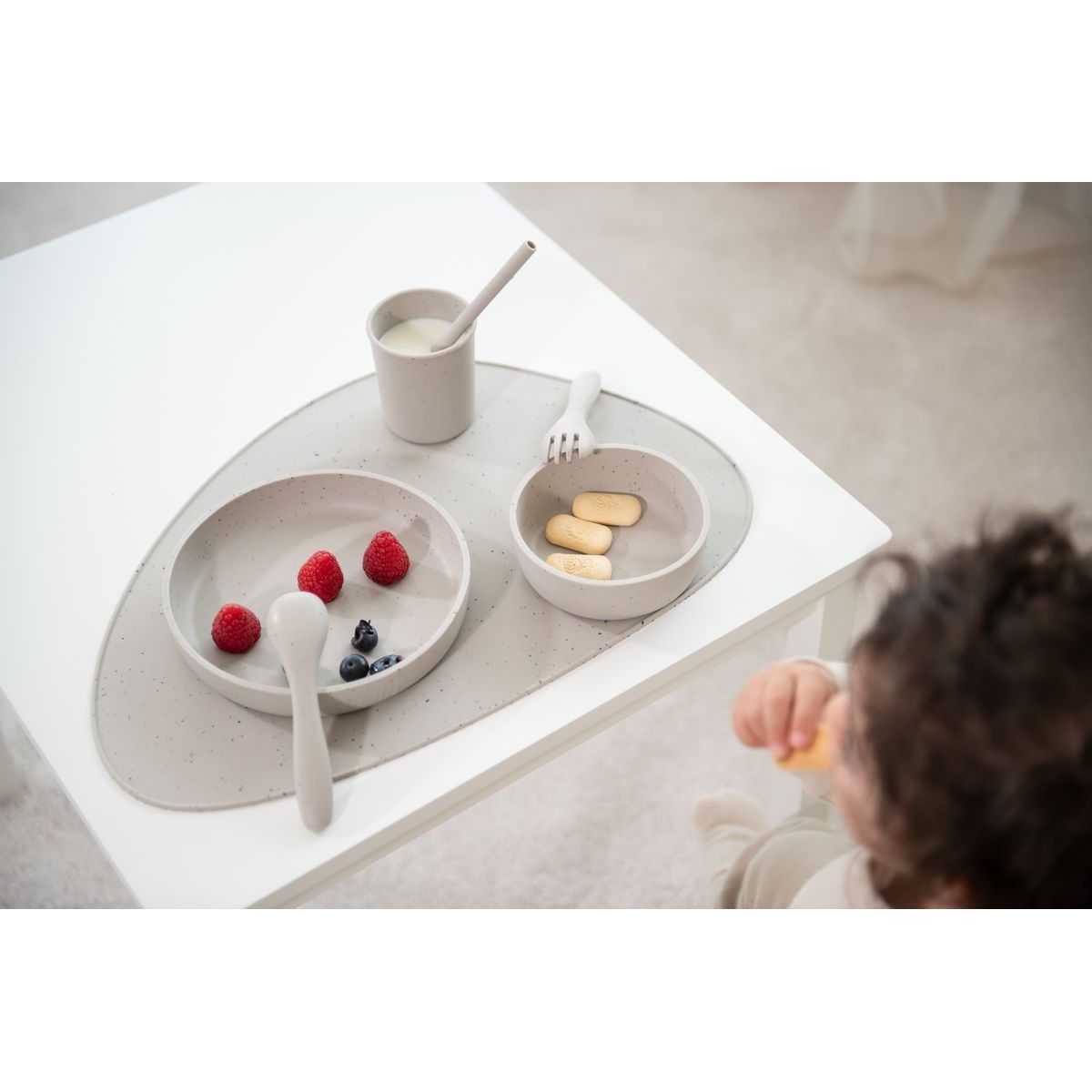 KikkaBoo Jídelní sada 5-dílná Platinum Silicone Sand je kompletní souprava pro bezpečné a samostatné stolování dítěte od 6 měsíců. Sada obsahuje talíř se zvýšeným okrajem, kelímek vhodný pro dětské ruce, ergonomickou lžičku a vidličku s měkkými hranami a misku pro polévku či kaši. Vše je vyrobeno z 100 % potravinářského platinum silikonu – měkkého, hypoalergenního a odolného materiálu, odolného vůči teplotám od –40 °C do 230 °C. Sada je vhodná do myčky, mikrovlnné trouby i sterilizátoru.
